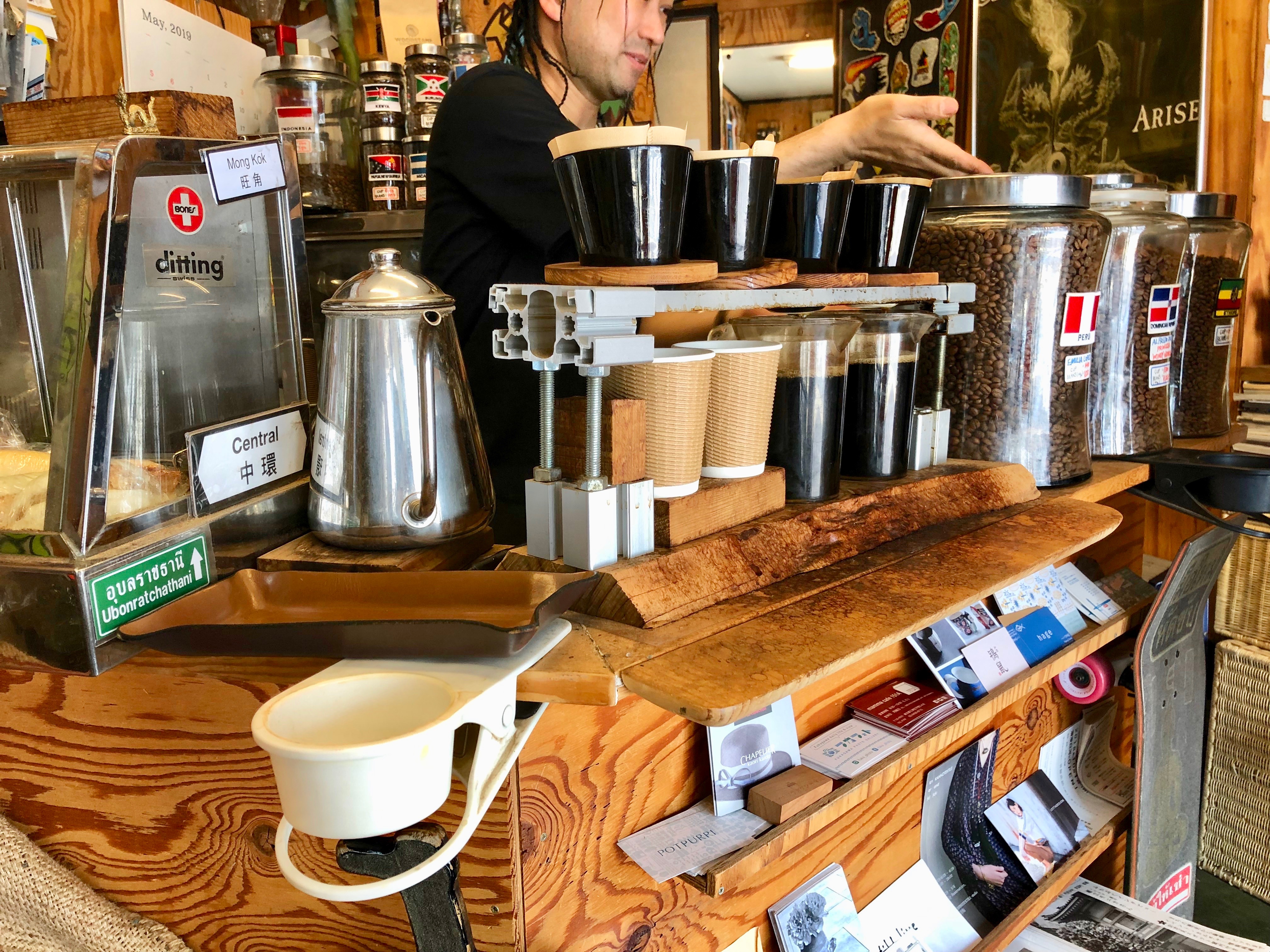 The first is Arise Coffee Roasters, a very small cafe space with just a few seats inside and some benches outside. This shop only sells black drip coffee, which is high-quality and hand-roasted. You can buy roasted beans here, too.