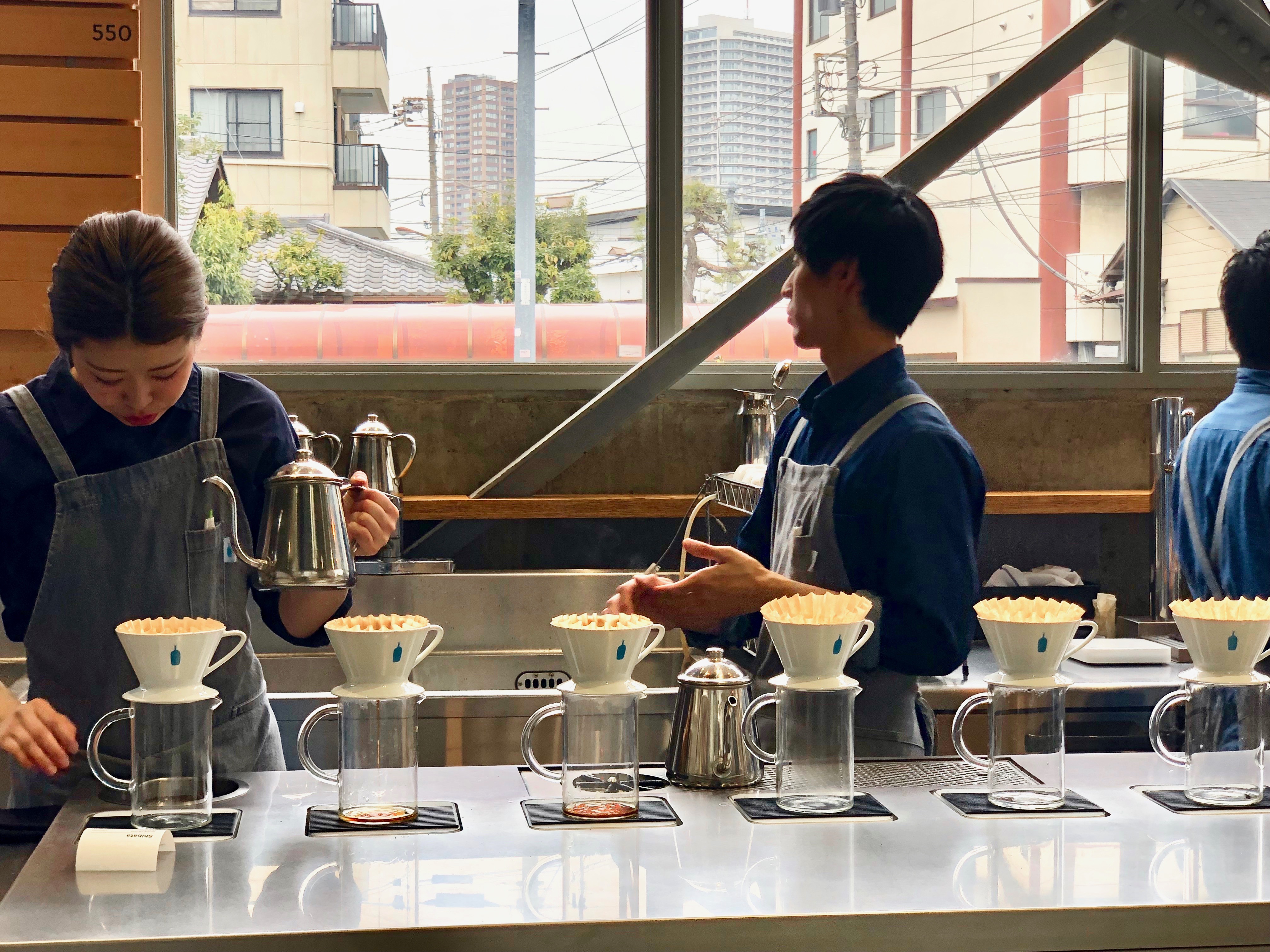Blue Bottle baristas brew and prepare drinks in front of customers, with the same dedication and precision seen in traditional Japanese kissaten and coffee brewing, like the two cafes mentioned earlier.