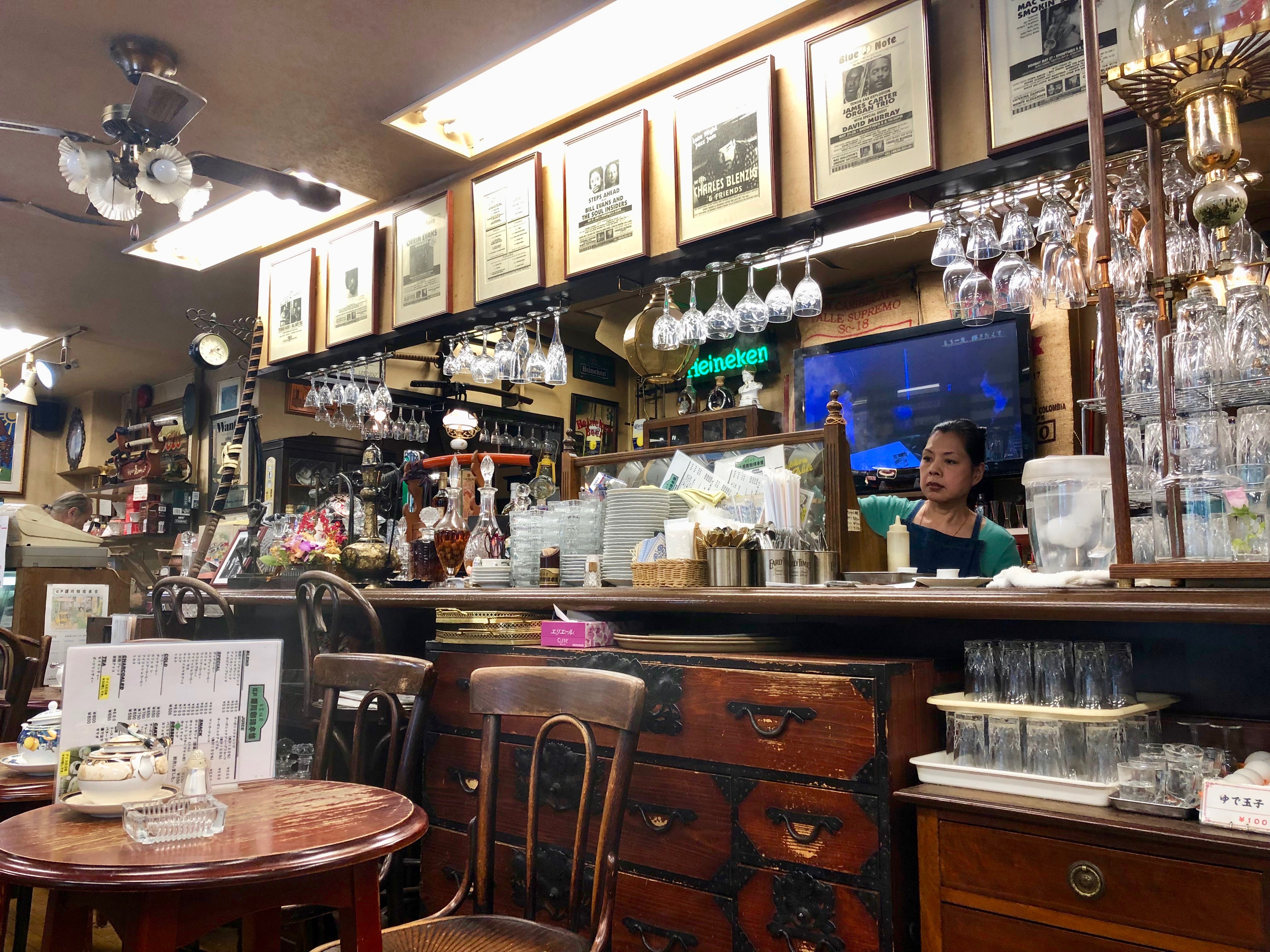 Next is Edo Fukugawa Coffee, a Showa-style kissaten cafe perfect for sitting down with a book or work. The classical atmosphere is very different than Arise, with antique decorations lining the dining area, katana on display, and coffee served in sophisticated porcelain cups and glassware.