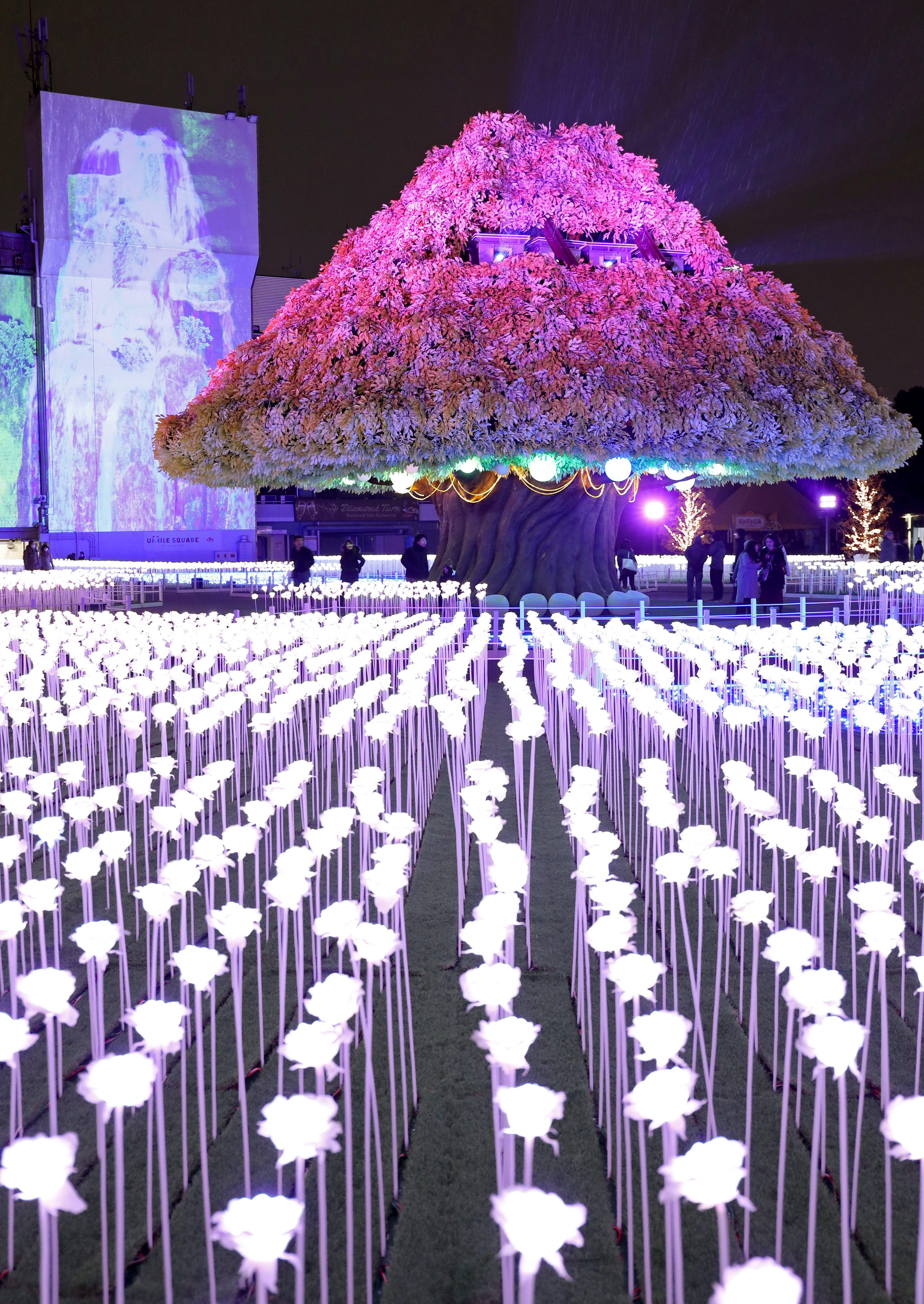 A 10-meter-high light installation in the shape of a large tree sits at the center of the square. As you look around, your senses will be hit by more than 20,000 rose-shaped LED lights, forming a beautiful garden.