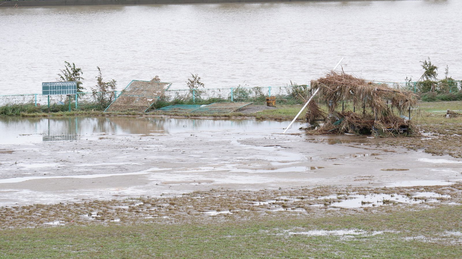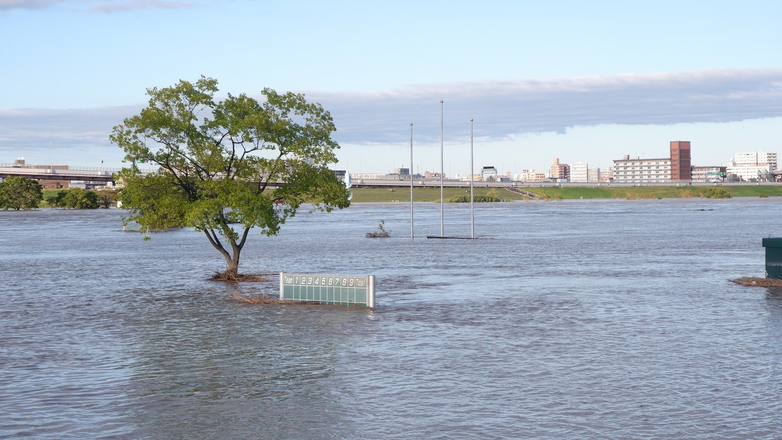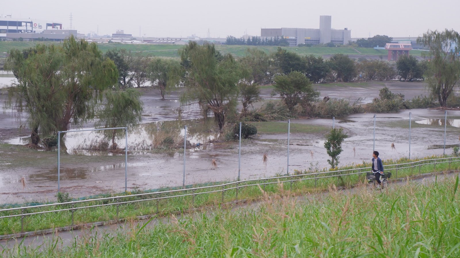 The “duck pond” in Photo 4 is actually a completely submerged municipal golf course. There are a number of public and private courses on the overflow areas within the Arakawa banks. The municipal golf course shown in the photographs is now visible, but far from usable.