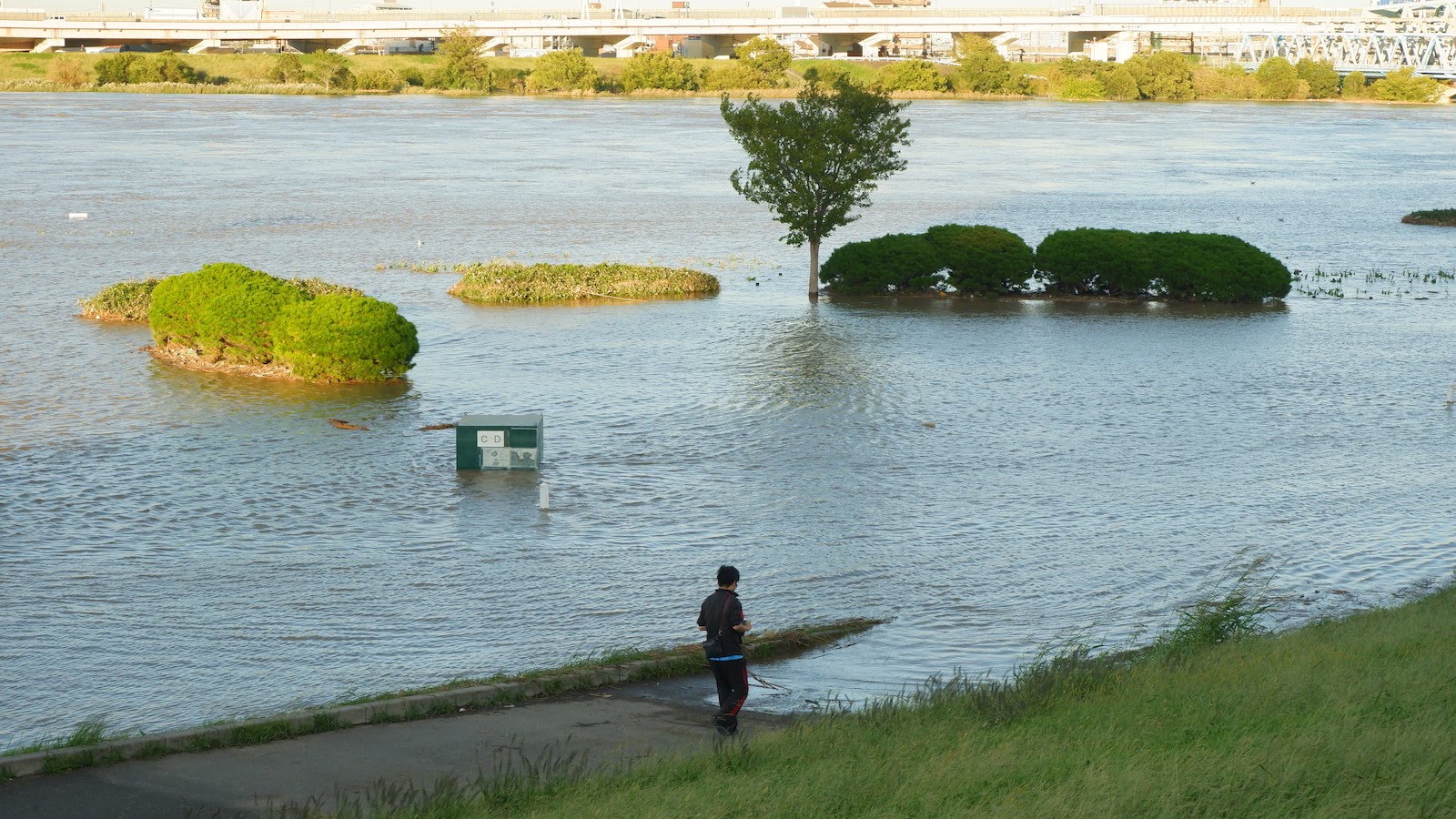 Photos 2 (above) shows the Arakawa in full flood state. My son, who assisted in the photography, is looking toward Kawaguchi on the other side of the river. Usually, the Arakawa is only a few hundred meters bank to bank. But when the flood photographs were taken, it was several kilometers bank to bank. Not only was the water not far from overflowing the levees at some points, but there was a very strong current.