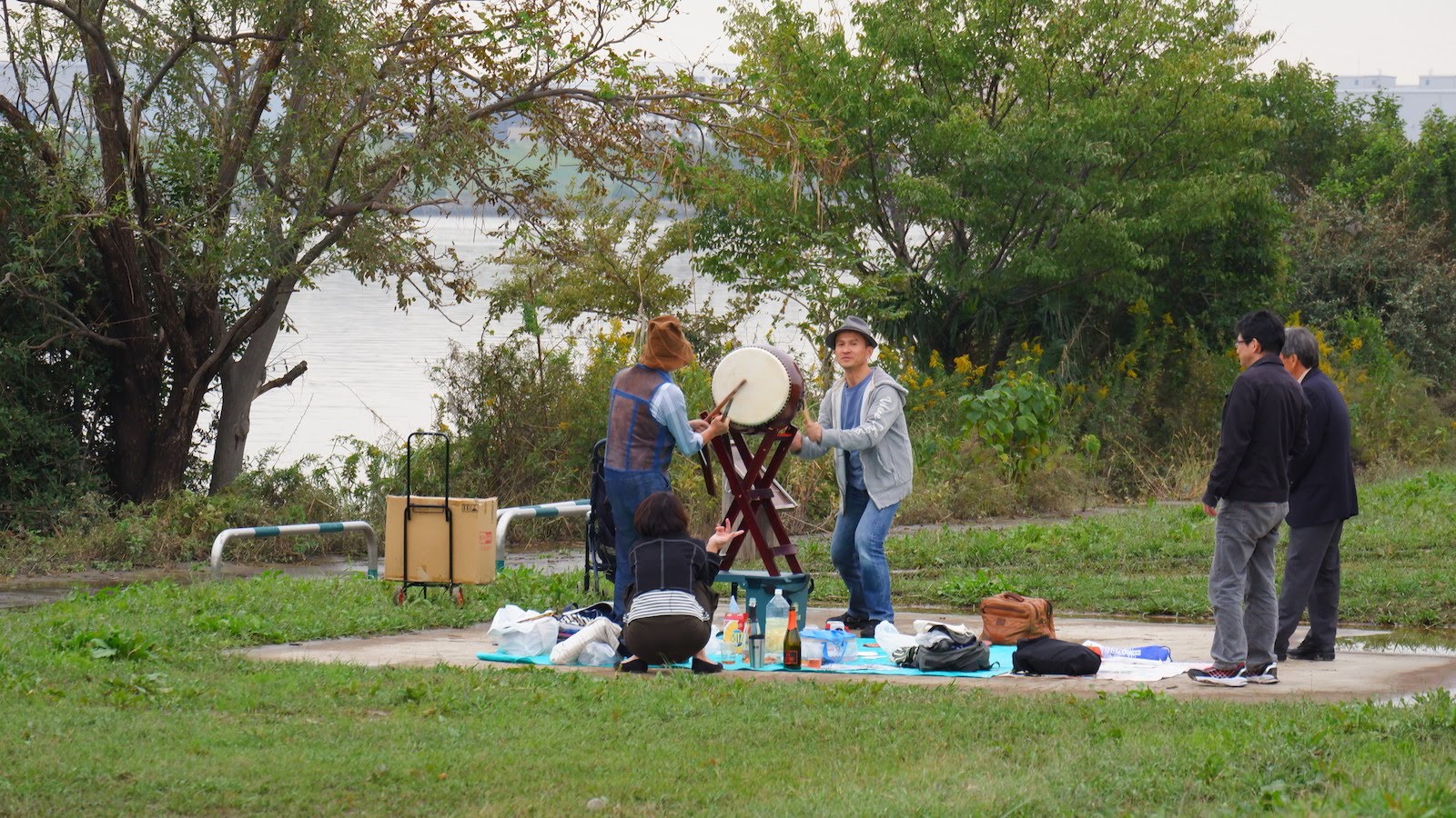 The banks are popular places for people with loud musical instruments to practice. I have seen and heard drummers, saxophonists, and bagpipes. Once near the Iwabuchi Floodgate, I saw a fellow dressed as Count Dracula. He had a large white bird on his shoulder and was practicing card tricks.