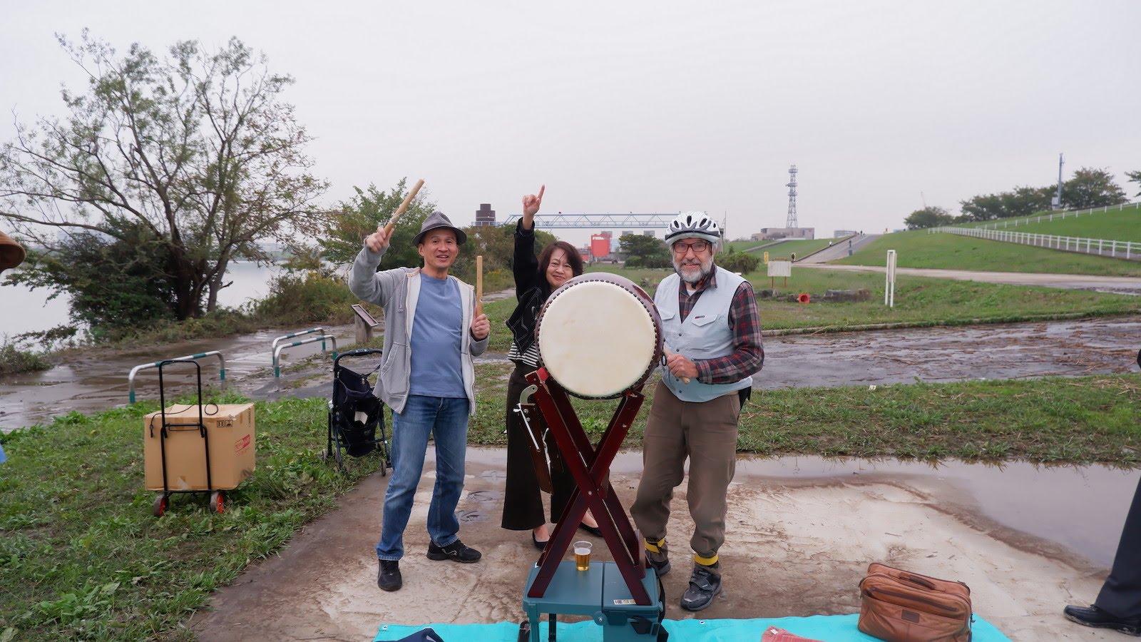 While doing follow-up photos one week after the river crested, I noticed a group of Japanese having a picnic and practicing with a small Japanese drum. Before I could ask them for permission to take their picture, one of the group came to me with a smart phone in hand and asked me to take a group picture of them. Not only that, but I was asked to have a go at the drum and pose with them for pictures.