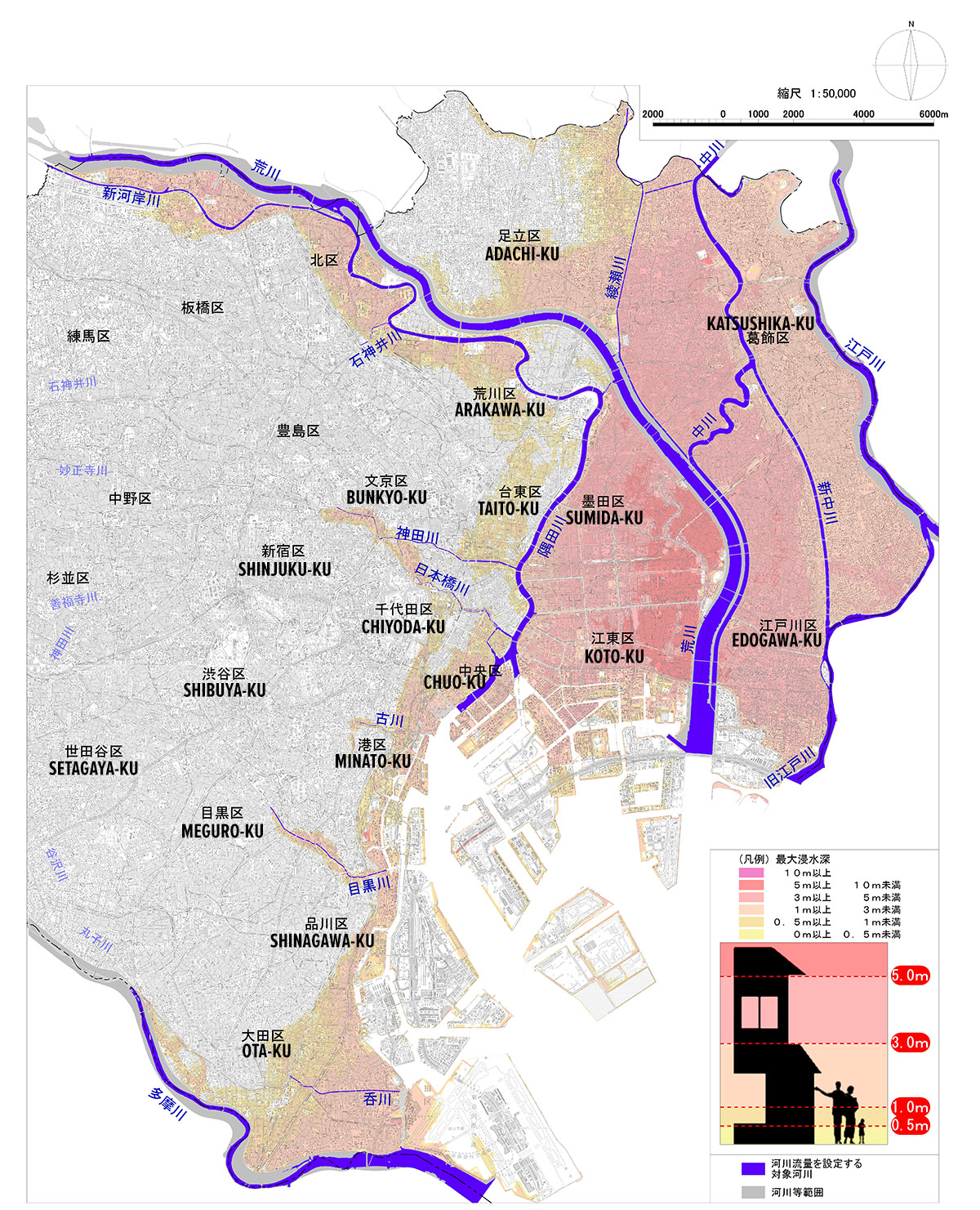 It is a 22-km channel that runs through a number of low-lying Tokyo wards, including Kita, Taito, Arakawa, and Adachi, as shown on the map below. It was constructed between 1911 and 1930 in an attempt to control the chronic flooding of low-lying parts of eastern Tokyo, and has done that job admirably well. While there have been minor cases of overflow, the levees have never failed.