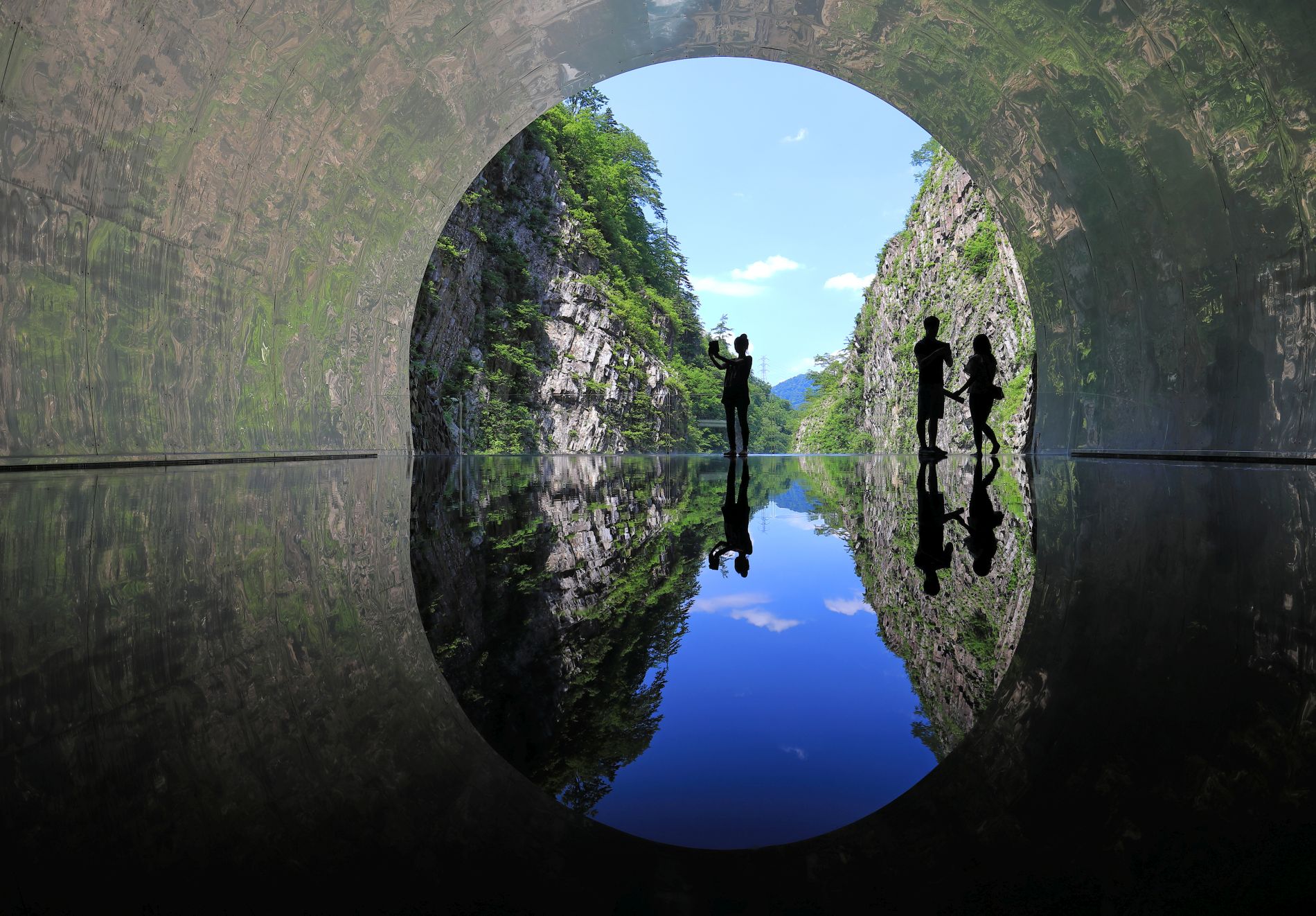 Here, I am surrounded by an enclosed space that makes me feel like I have wandered into an unknown world. An installation of a shallow pool of water reflects the view of the V-shaped gorge outside the tunnel. In turn, the reflection gives off an infinite illusion of the sky and the ground merged into one.