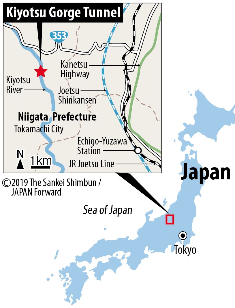 The Kiyotsukyo Gorge Tunnel (Tokamachi City, Niigata Prefecture) is enveloped in chilly air as I walk through. After about a 20-minute stroll, the 750-meter passageway brings me to the end of the tunnel.