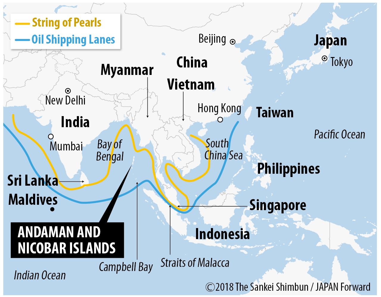The 572 islands of India’s Andaman and Nicobar archipelago are spread over an area of roughly 8,249 square kilometers and lie at the mouth of the Straits of Malacca. These straits are the second largest oil trade choke point in the world, and it is estimated that 16 million barrels of petroleum and other liquids pass through them every day.