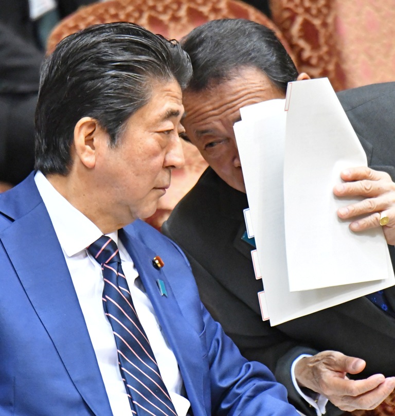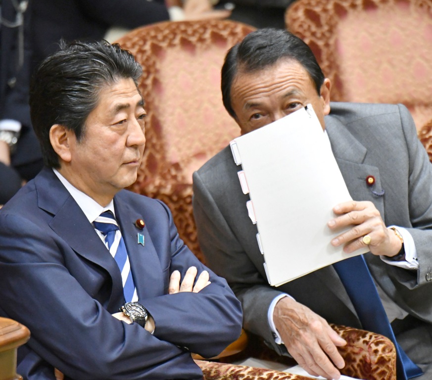 参院予算委員会に臨む安倍晋三首相(左)と麻生太郎副総理兼財務相=19日午前、国会・参院第1委員会室(斎藤良雄撮影)