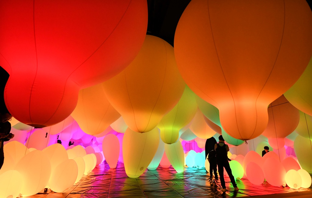 teamLab Borderless is a group of artworks that form one borderless world. Artworks move out of the rooms freely, form connections and relationships with people, communicate with other works, influence and sometimes intermingle with each other, and have the same concept of time as the human body.