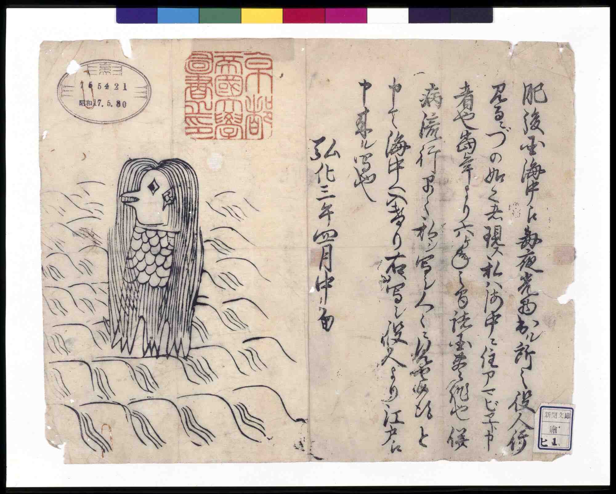 Duck-billed with long hair and a body covered in scales like a mermaid, the Amabie creature stands on its three webbed feet. A peculiar image of a yokai is depicted on a tile block print owned by the Kyoto University Library.