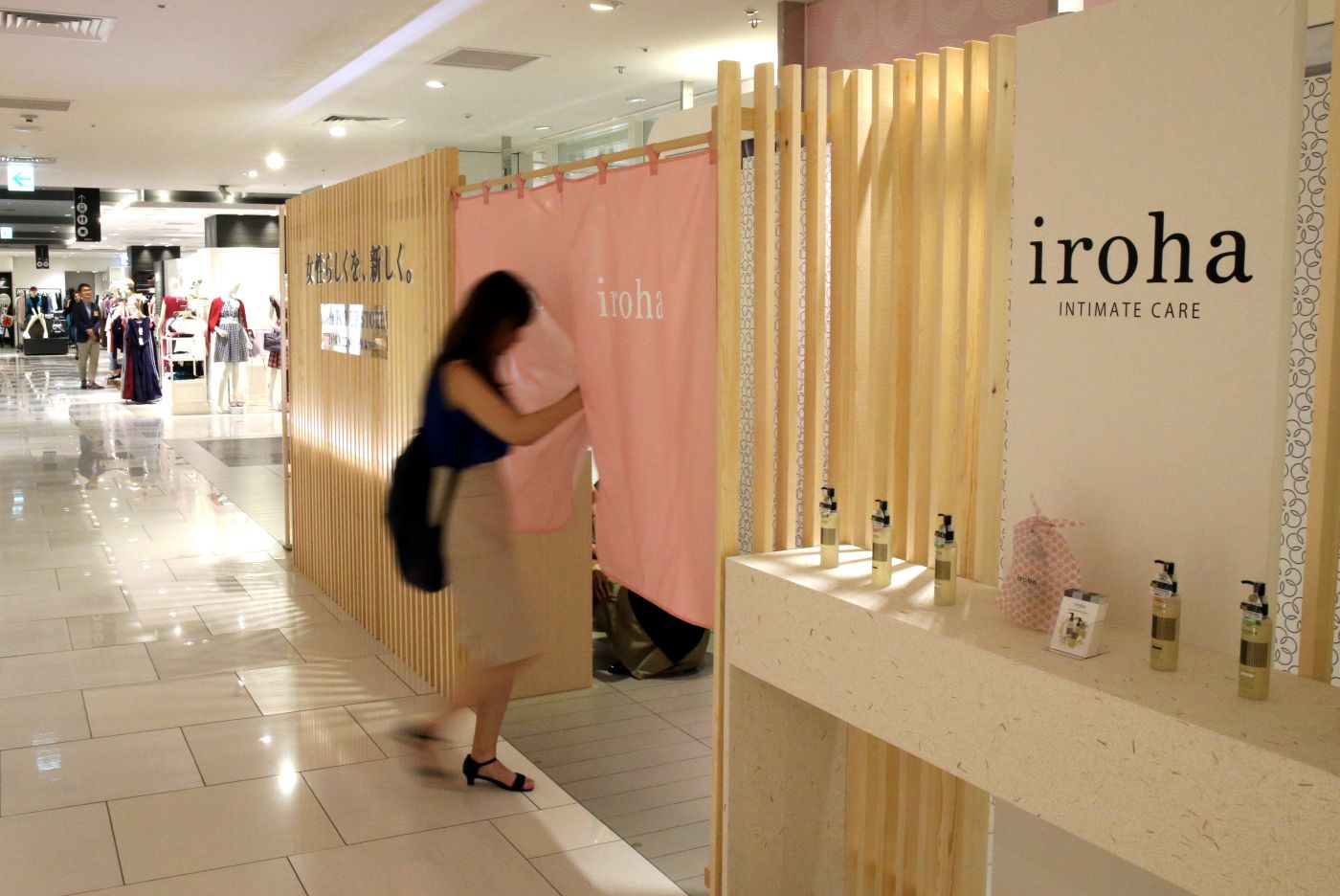 The pop-up shop was located for two weeks in a special spot beside the escalator on the fifth floor, a women’s floor named Ufufu Girls. Both men and women could be seen going through a dusky pink noren divider into a modern Japanese interior surrounded by vertical wood lattice. The gaps in the lattice allowed a glimpse of the interior while obscuring the identity of anyone inside, for privacy.