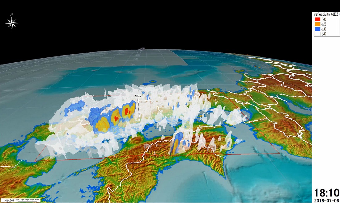 The string of extremely severe downpours in western Japan occurred when a seasonal rain front cut through the eastern and western regions of the Honshu mainland, becoming extremely intense and hovering over many areas of western Honshu. Record-breaking precipitation was registered in several parts of the western region.
