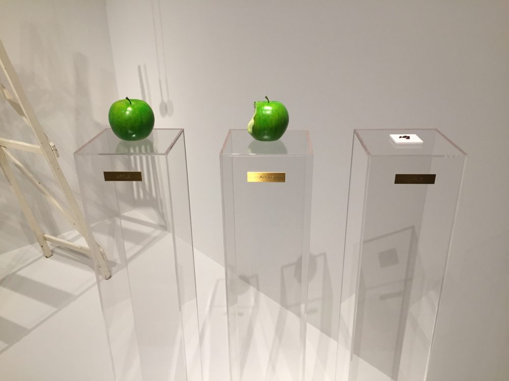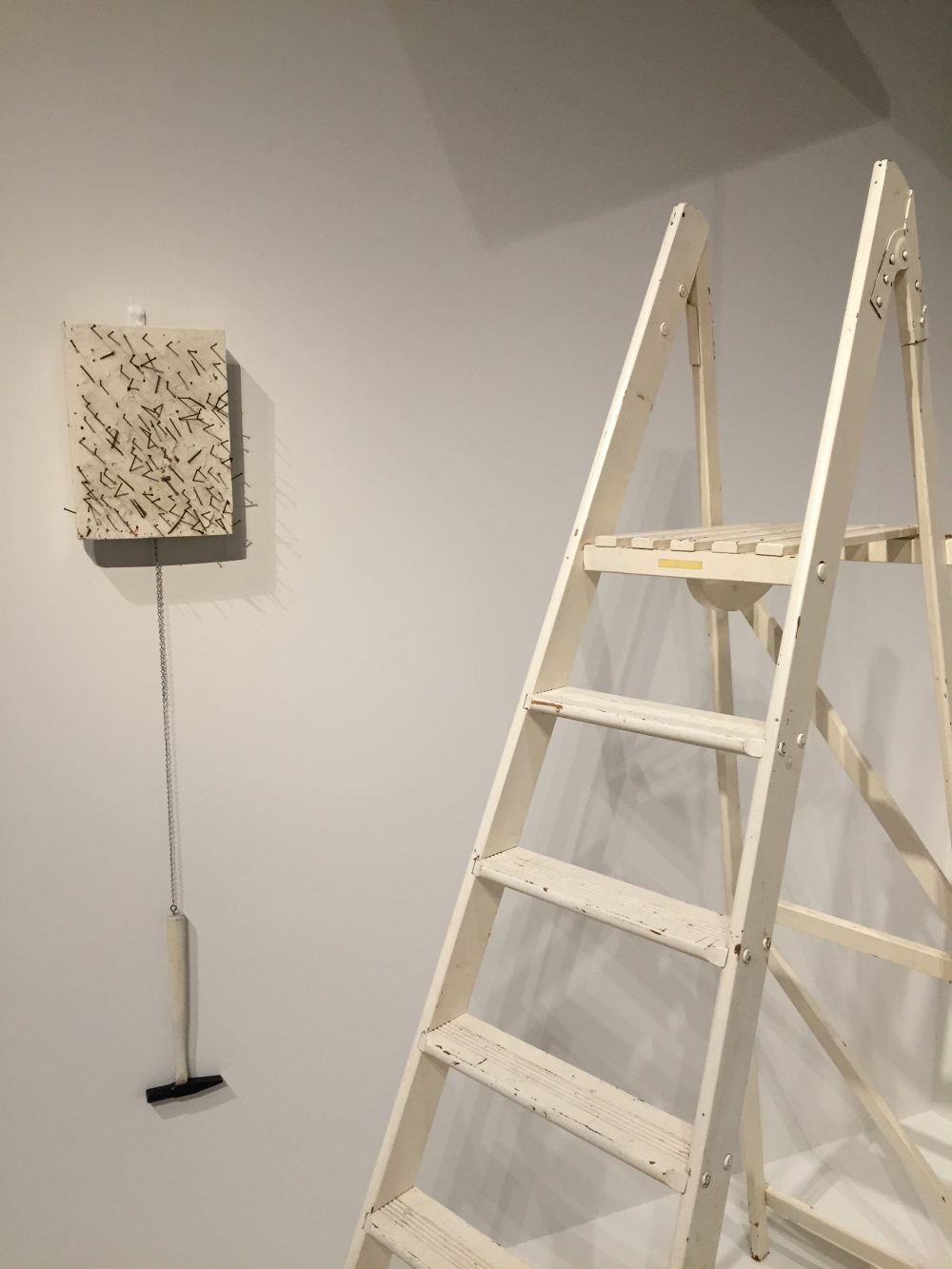 There is also a display, alongside a video interview of the couple explaining its significance, of “Ceiling Painting/ Yes Painting”. The installation features a ladder, and above it a canvas, with a magnifying glass attached.