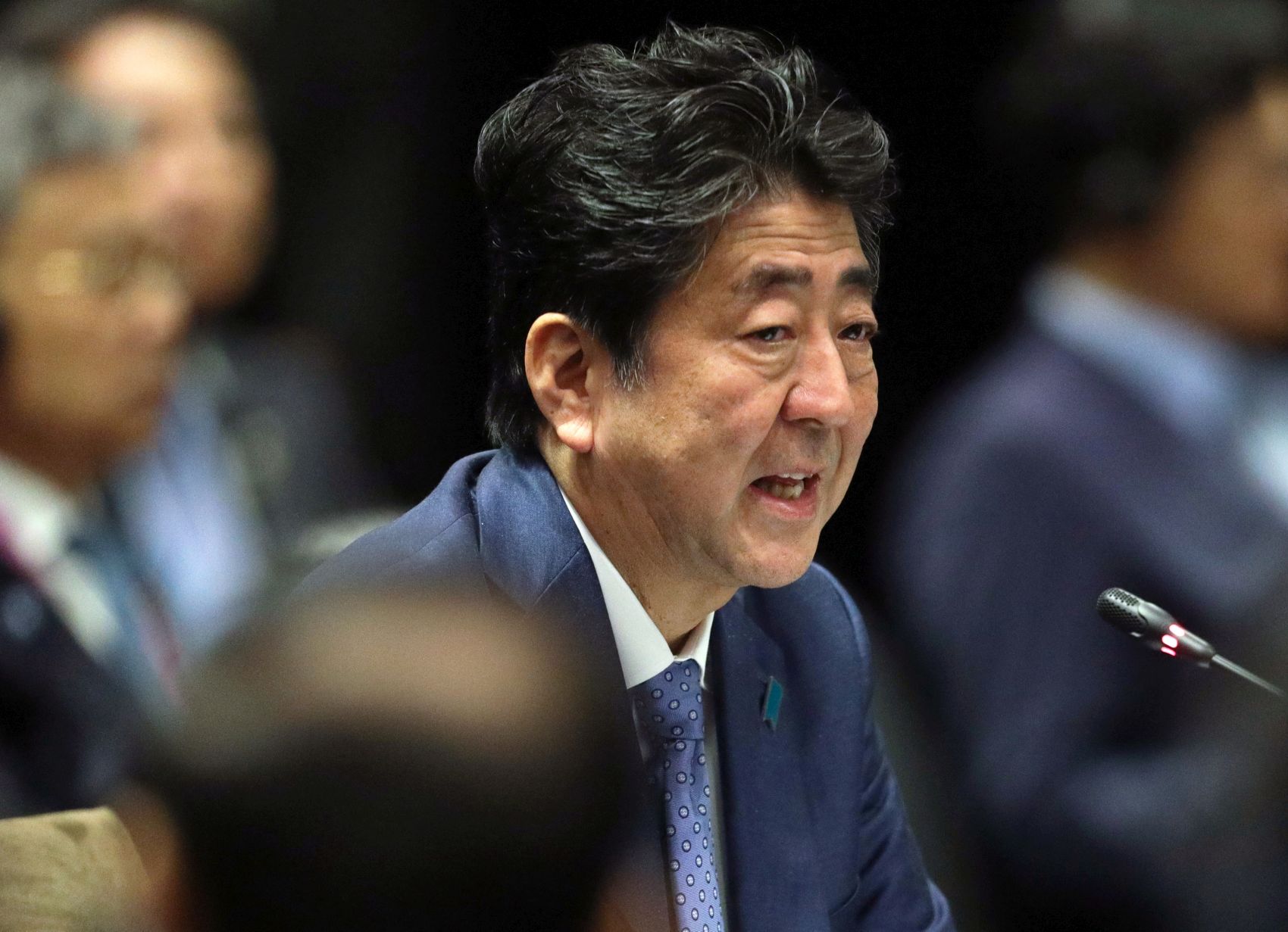 Japanese Prime Minister Shinzo Abe, fifth left, and ASEAN leaders pose for a group photo during the 21st ASEAN-Japan summit on the sidelines of the 33rd ASEAN summit in Singapore,
