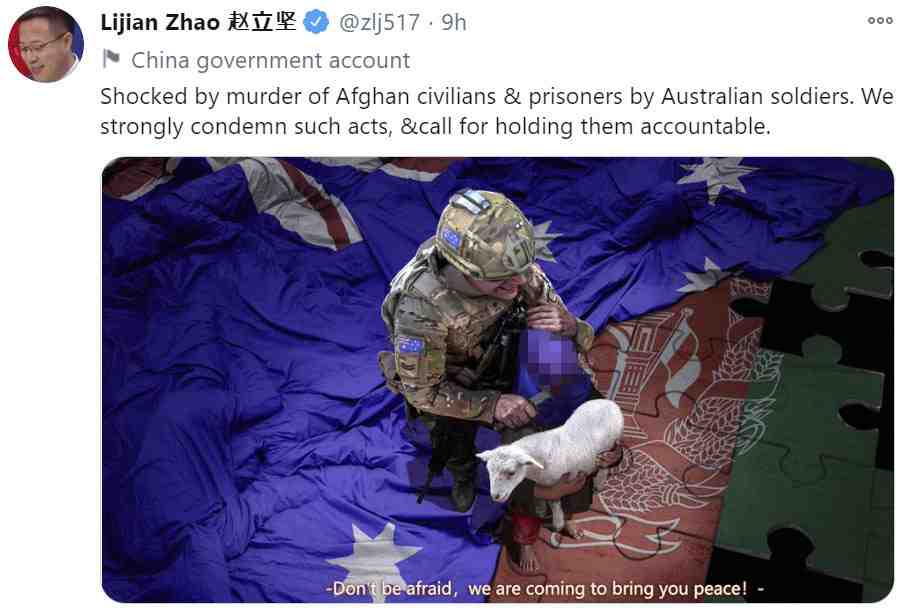 A November 30 tweet by Chinese Foreign Ministry spokesperson Zhao Lijian contained a fabricated scene of unknown origin depicting Australian peacekeeping troops committing atrocities against Afghan civilians, raising a storm of controversy.