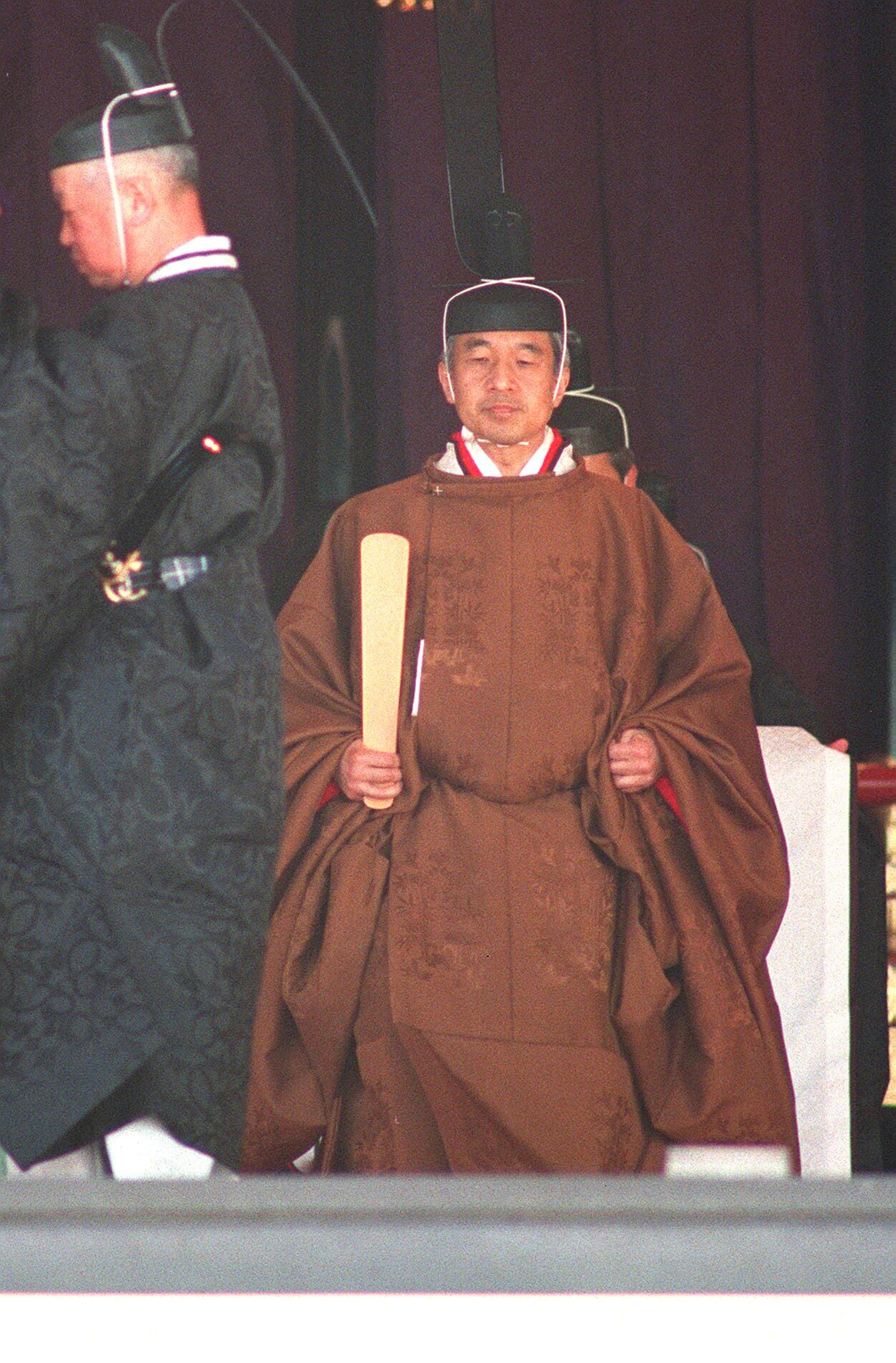 At the ceremony, Empress Masako stood on a similar elevated structure, called the Michoudai, to the right of her husband. Both Naruhito and his wife were wearing traditional imperial kimonos befitting their roles.