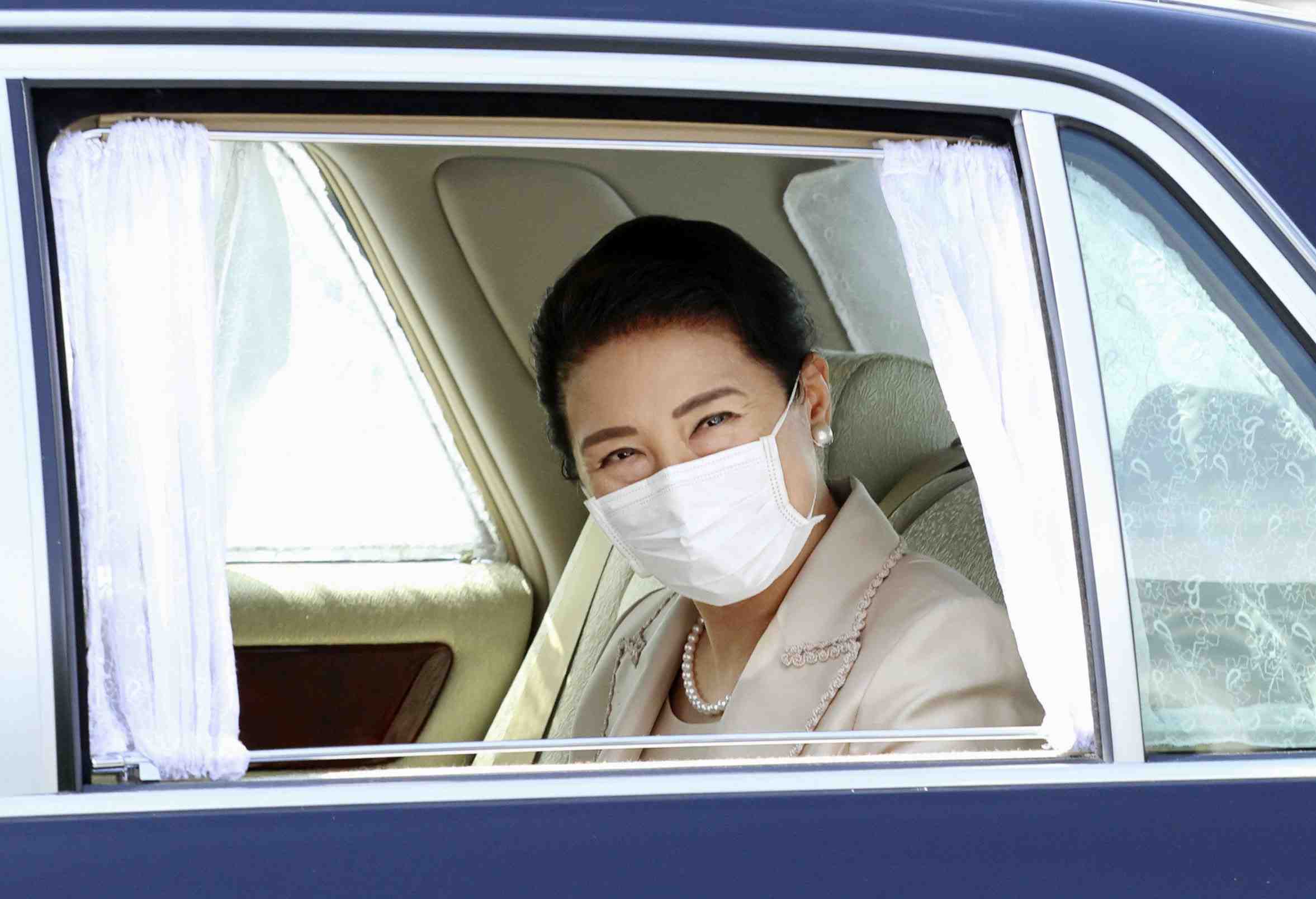 Empress Masako was seen wearing a mask and waving to a crowd from the open window of her car as it drove past the Hanzomon Gate at the Imperial Palace just before 10 A.M.
