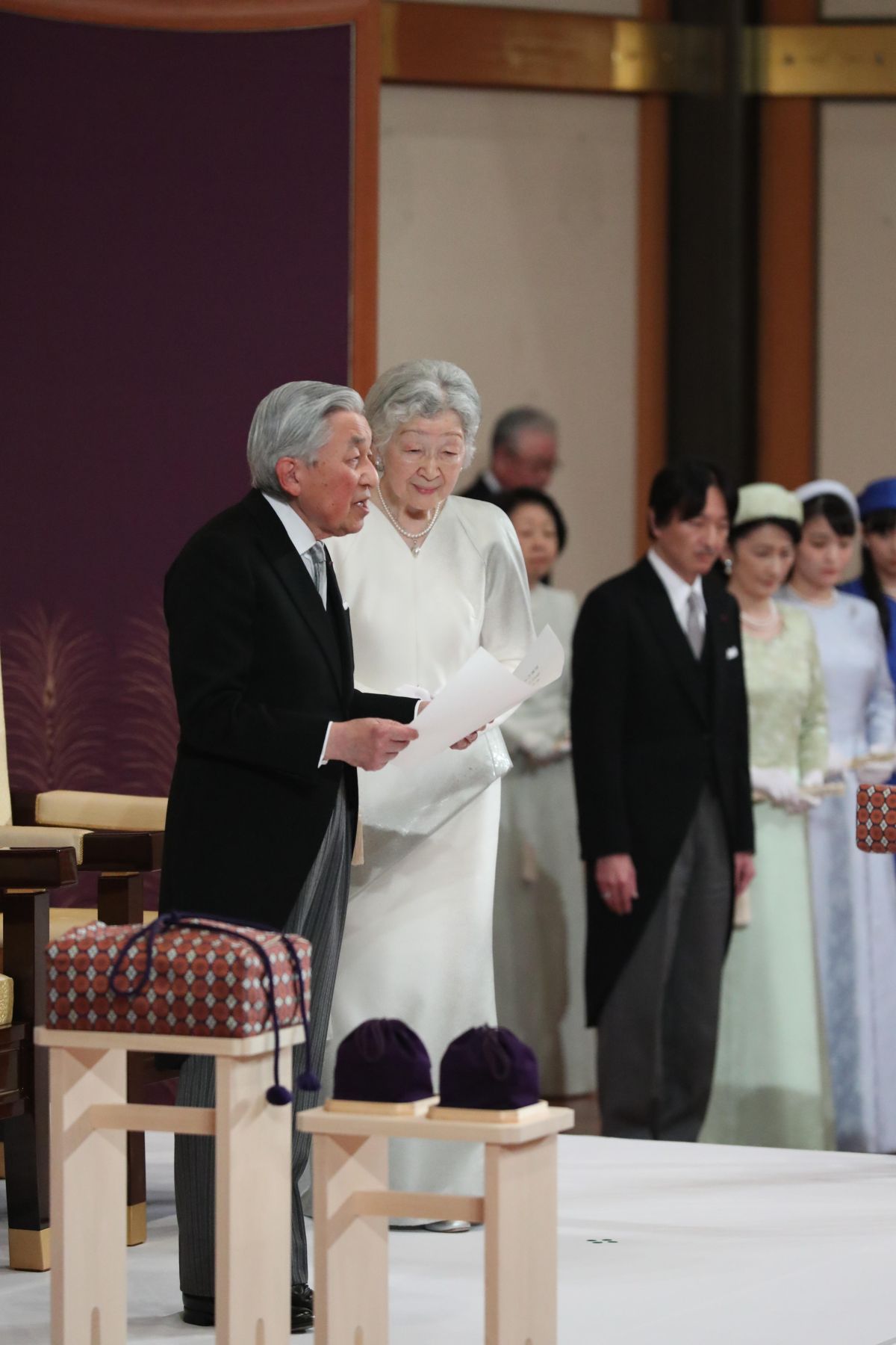 Emperor Akihito then read the following speech to the guests present for the ceremony, with Empress Michiko, 84-years-old, standing by his side.