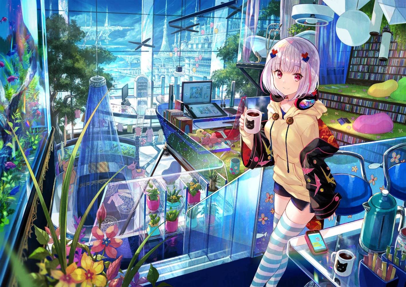 While many works on display in the Eshi-100 exhibition are in accord with the theme of Japanese traditional “Wa,” a spirit of harmony, some pieces are of a completely different nature. Illustrator Choko Fuji’s work, My Ideal Room, depicts a life many people may yearn for. Representative of an everyday “miyabi” lifestyle, the piece shows a room embellished with a wealth of things, such as an aquarium coupled with a pool by the window, a panoramic view seen spreading beneath the room of a high-rise building, plus other features of an affluent life.