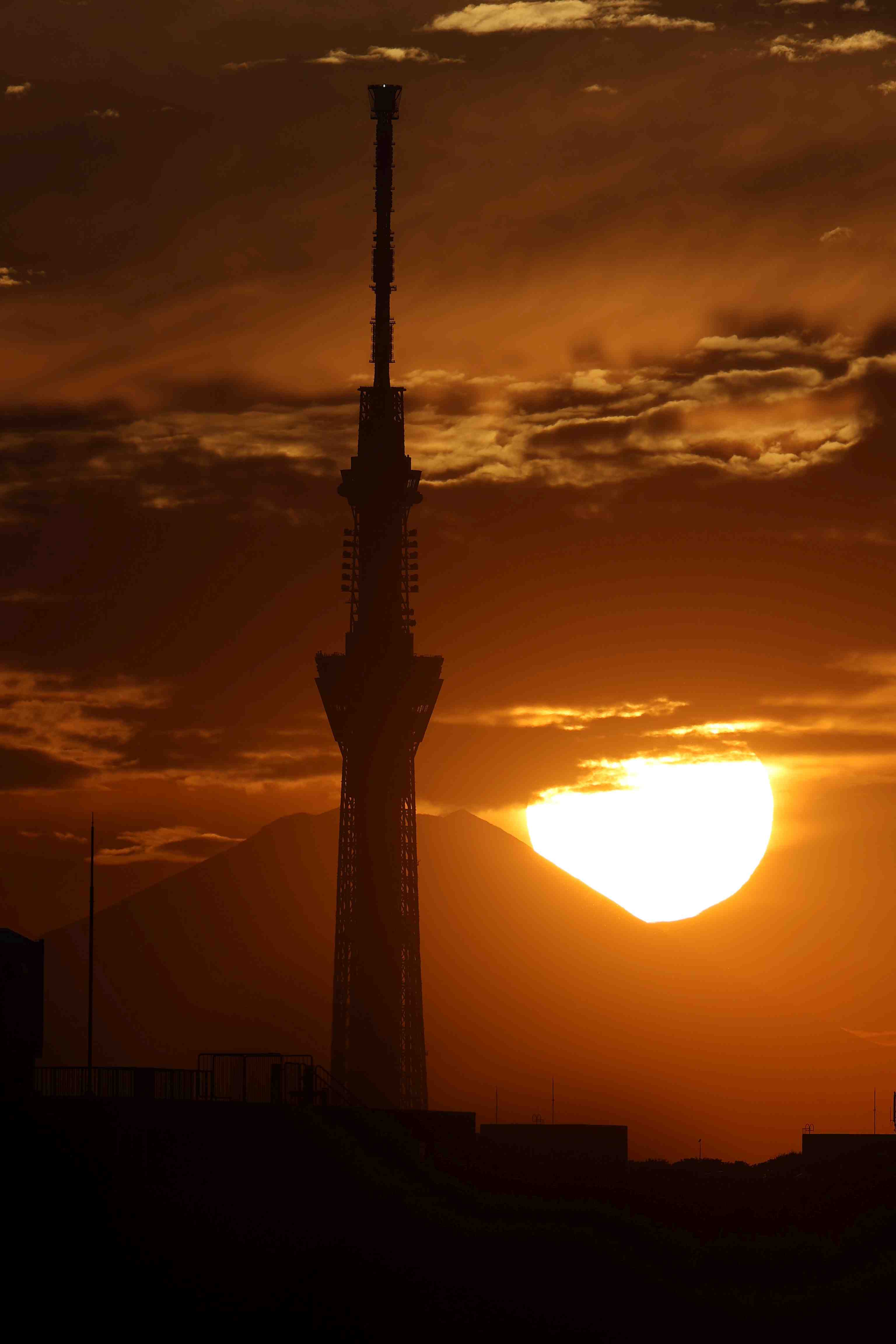 When viewed with a super telephoto lens, Mount Fuji and Skytree appear to overlap, but in fact the two are more than 100 kilometers apart.