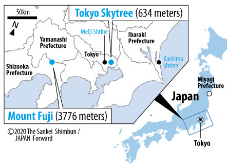 In a residential neighborhood settled on high ground in Chiba Prefecture, there is a spot somewhat well known among photography enthusiasts, where Mount Fuji and the Tokyo Skytree (in Tokyo’s Sumida Ward) align.