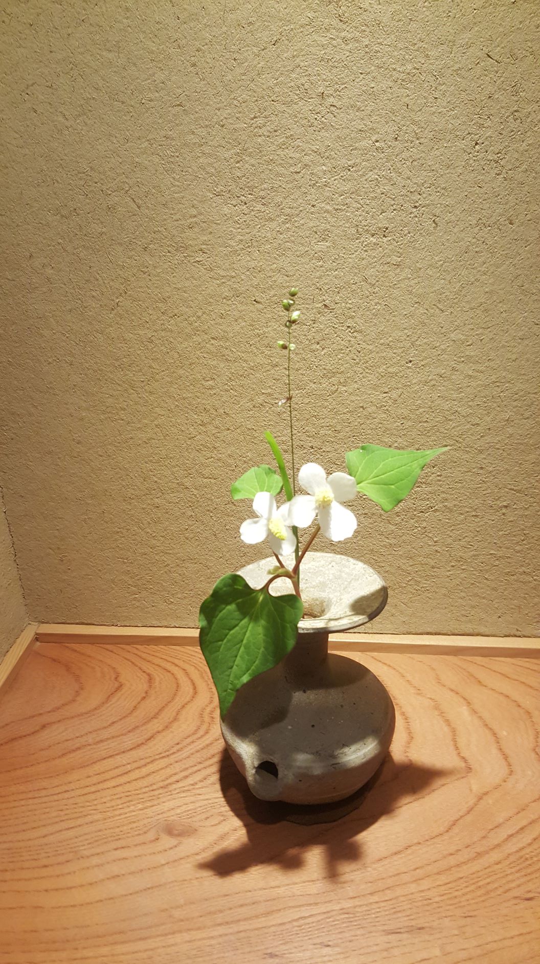For his arrangements Nishiyama uses ferns, wild grasses, stems, leaves or branches, some crooked or covered with moss. Outside his shop, young rice plants are growing in an old stone trough. I buy a daimonj, a delicate plant with a white flower the shape of the kanji 大 dai, big. He checks to make sure it will grow in Sapporo.