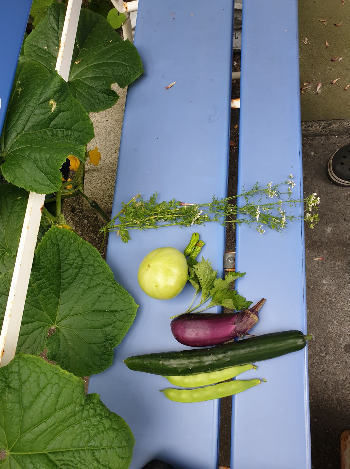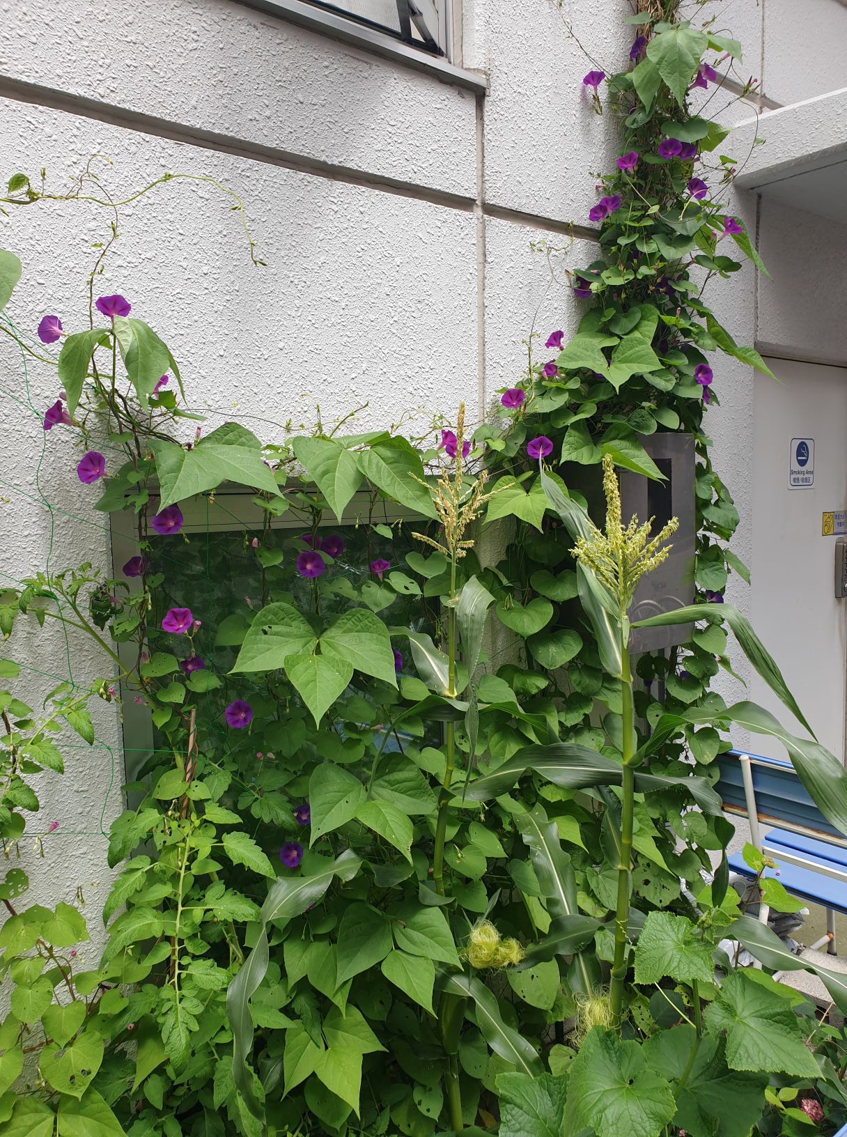 By July, the morning glories and the beans had reached the third floor of the building. It was a sea of purple glory. I was not sure how to harvest the beans, though. The corn had grown taller than me, while tomatoes, aubergines and cucumbers formed a wild vegetable jungle below.