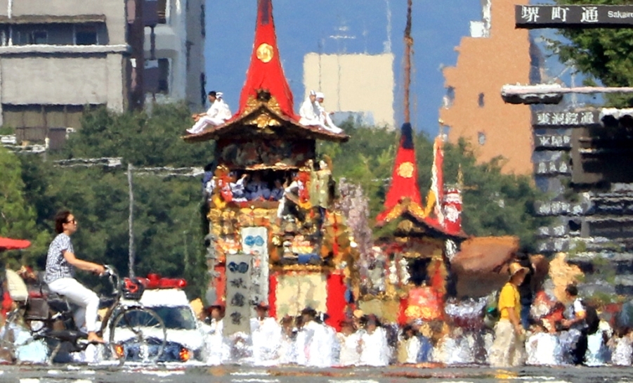 Those who were not beaten by the high temperatures could enjoy the characteristic parade, in which the procession of yamaboko are famously turned around street corners and pulled through the Gion district of Kyoto by a team of float attendees.