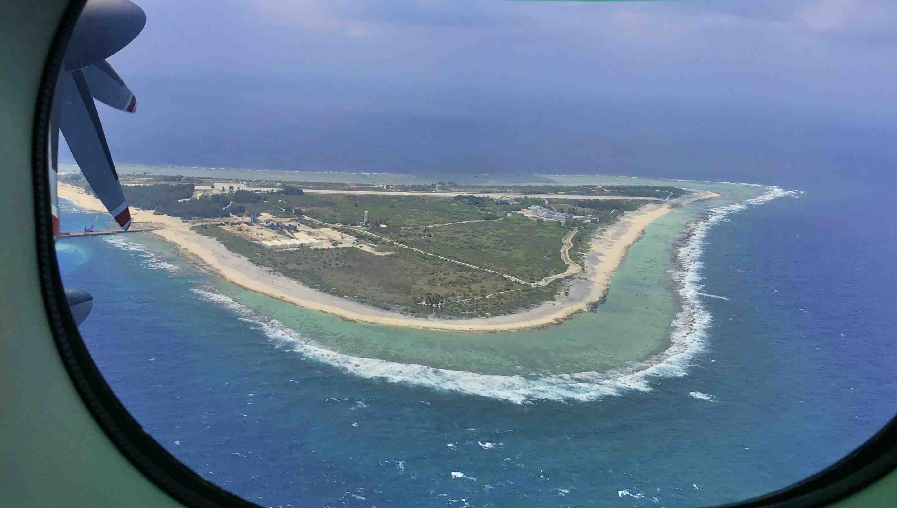 After about four hours of flight aboard an MSDF plane from Atsugi Air Base in Kanagawa prefecture, a straight white line appeared on the surface of the cobalt blue sea stretching out before the aircraft’s front window. It was the silhouette of the island. Because of its flat topography on a base of coral, the island looks like a white line when seen from a distance.