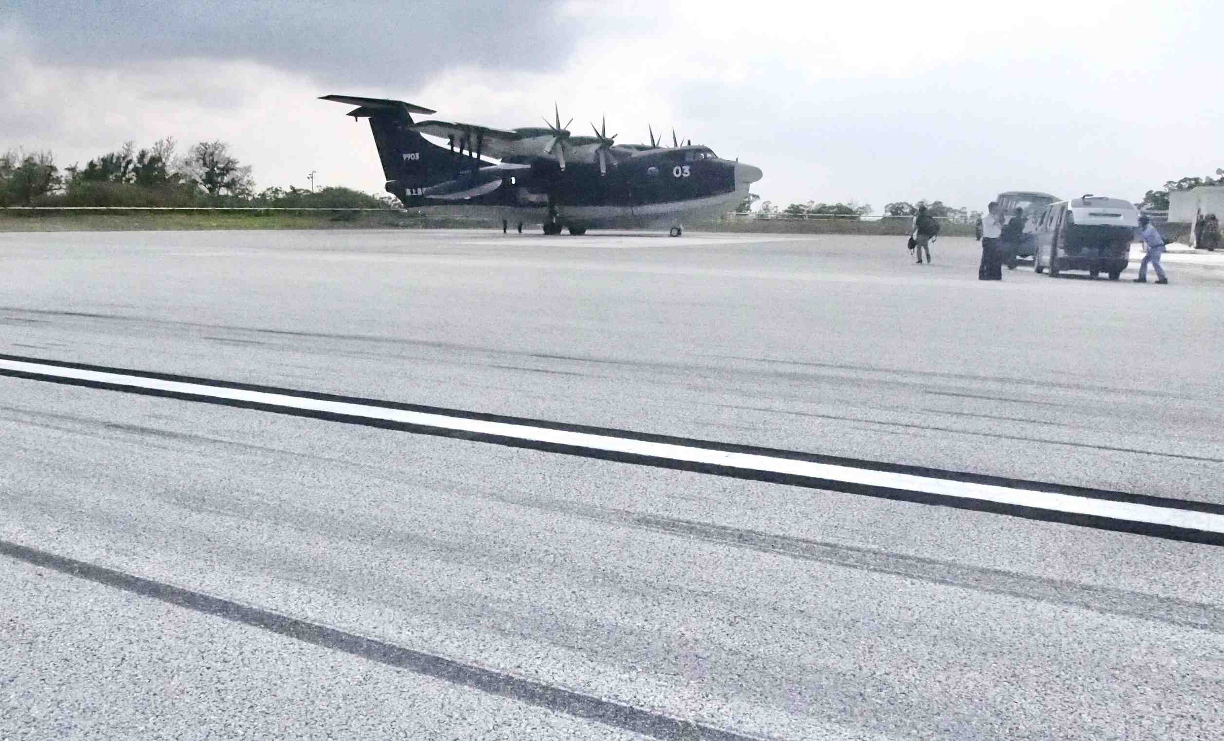 We landed on the island’s runway, to find temperatures of 32 degrees C waiting for us. Measuring 1,370 meters long and 45 meters wide, the runway, built by the former Imperial Japanese Navy in 1936, is in good condition with no significant cracks. Today, its maintenance and management and refueling of SDF aircraft that land there are carried out by the JMSDF air dispatch unit.