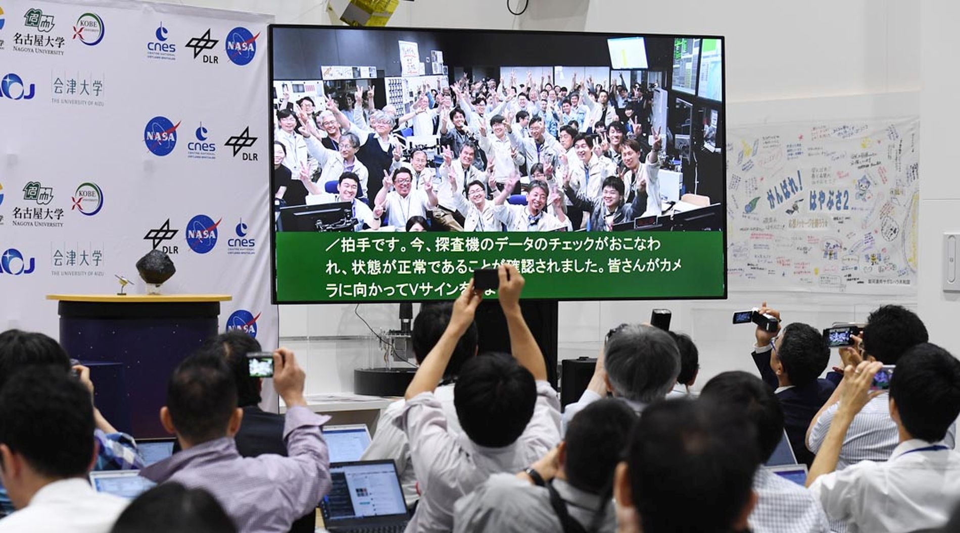 The thorniest hardship encountered was Hayabusa2’s initial landing on the Ryugu asteroid in February. Contrary to expectations, Ryugu was found to be strewn with rocks, with little space for the space probe to touch down safely. The JAXA team then recalculated the landing, thoroughly testing the performance of Hayabusa2 by repeatedly practicing descending flights. This eventually led to the space probe’s successful touchdown on a narrow strip of flat ground.