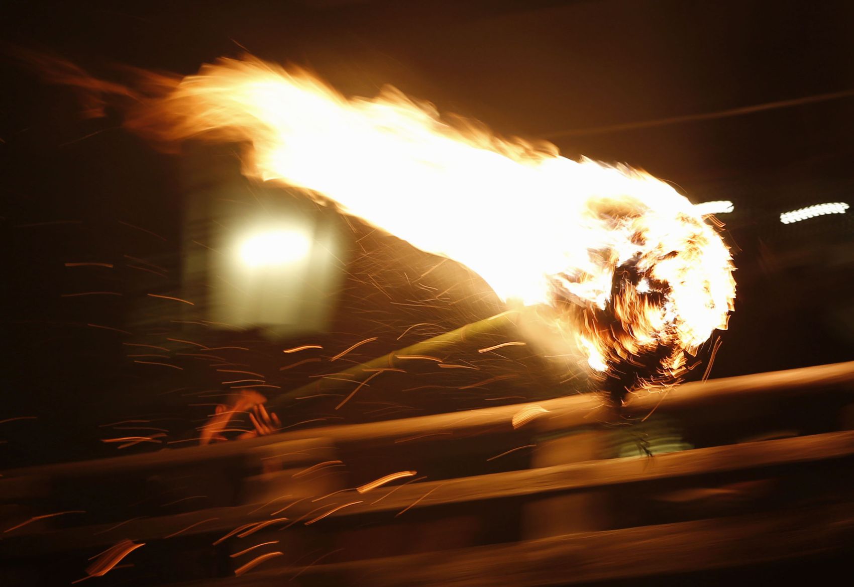 Standing watching the proceedings is the crowd of worshippers huddled below. As the torch is carried quickly above them, spinned and whipped around, sparks and ashes fall on the people, which is said to be good luck and ward away evil spirits. It’s a spectacle that has the crowd cry out in appreciation.