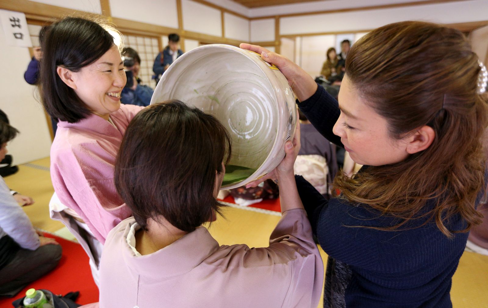 On January 15, the first tea ceremony of the year — called Ochamoroshiki — took place at Saidaiji Shrine in Nara. With 40 participants, it was a ritual which featured one interesting characteristic. As the ritual unfolded, guests passed around a huge cup of green tea — 40 centimeters wide and weighing more than five kilos!