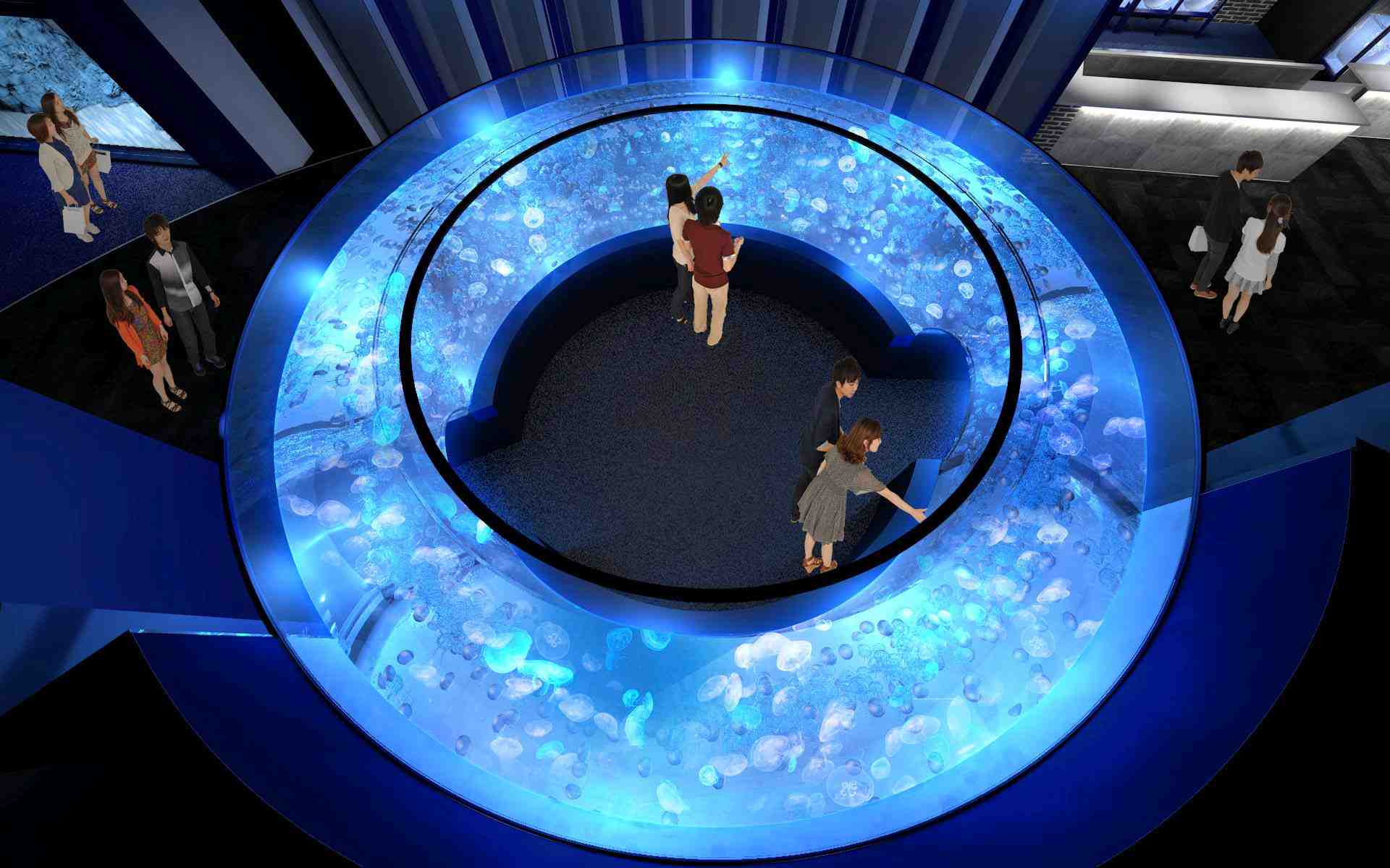 The display area covers 350 square meters and with 40 installed water tanks. The main attraction is “GURURI”, a tank with a panoramic dome measuring some 6.5 meters in diameter. It offers visitors a 360-degree view of 1,500 Moon jellyfish drifting inside the magically illuminated tank.