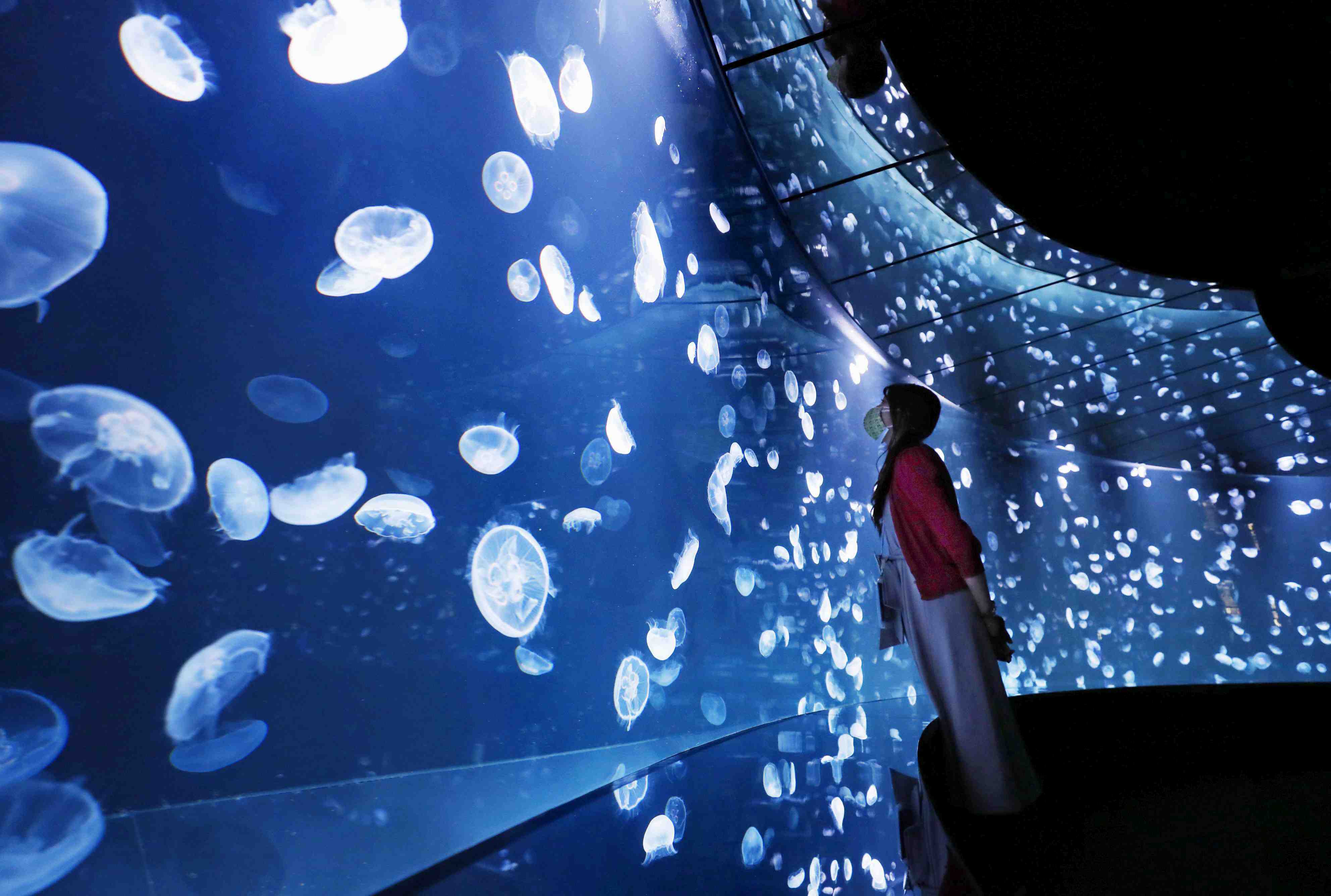 With a glass-floored deck extending over the open-tank, visitors can also feel as if they are floating on the surface of the ocean water along with the jellyfish.