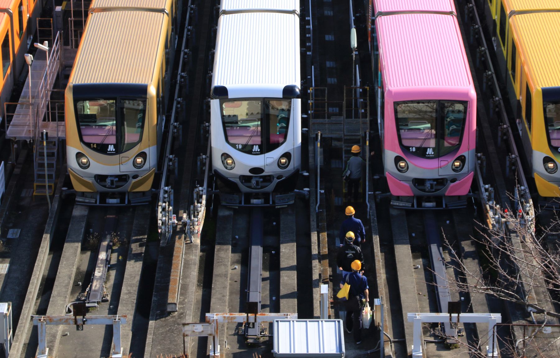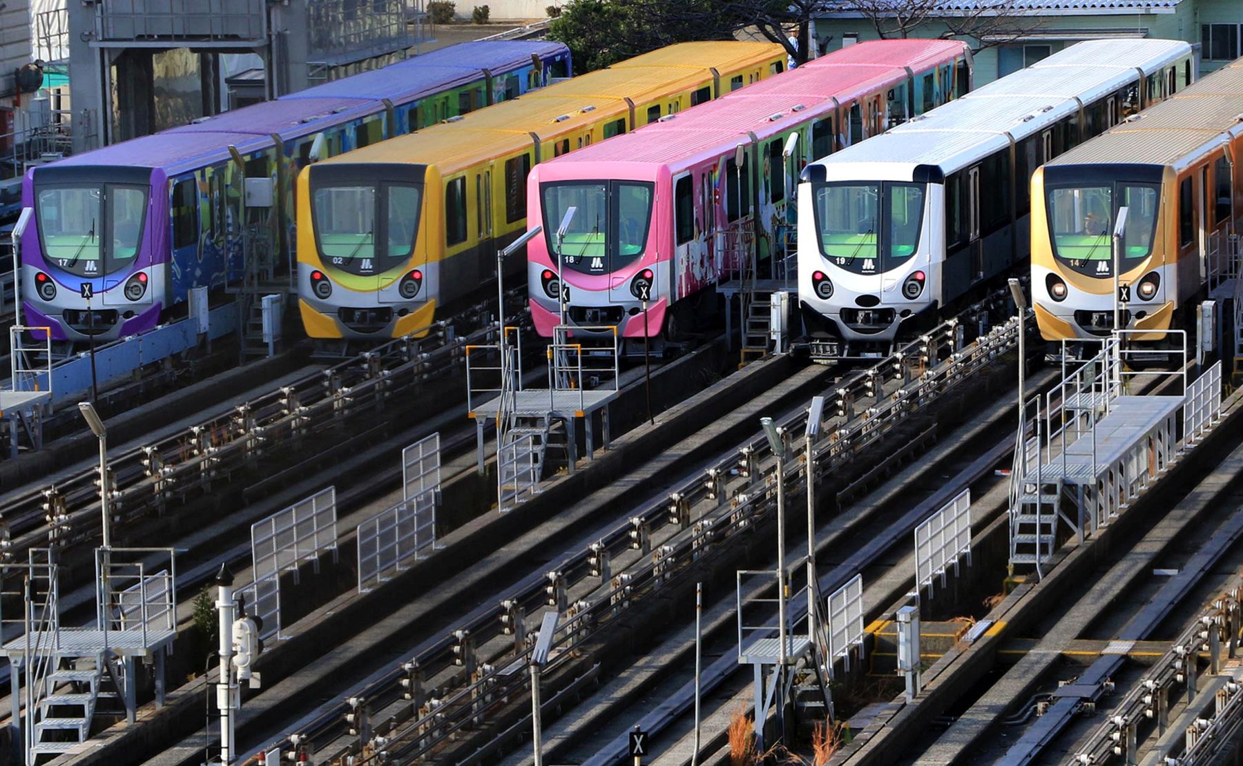 Osaka Metro Southern Harbor Port Town Line ‘Neutram’ trains are lined up in the Nakafuto railyard, Suminoe District, Osaka City. (Photo by Kenji Suzuki; Canon EOS 5D Mark III: EF70-300mm F4-5.6L IS II USM)
