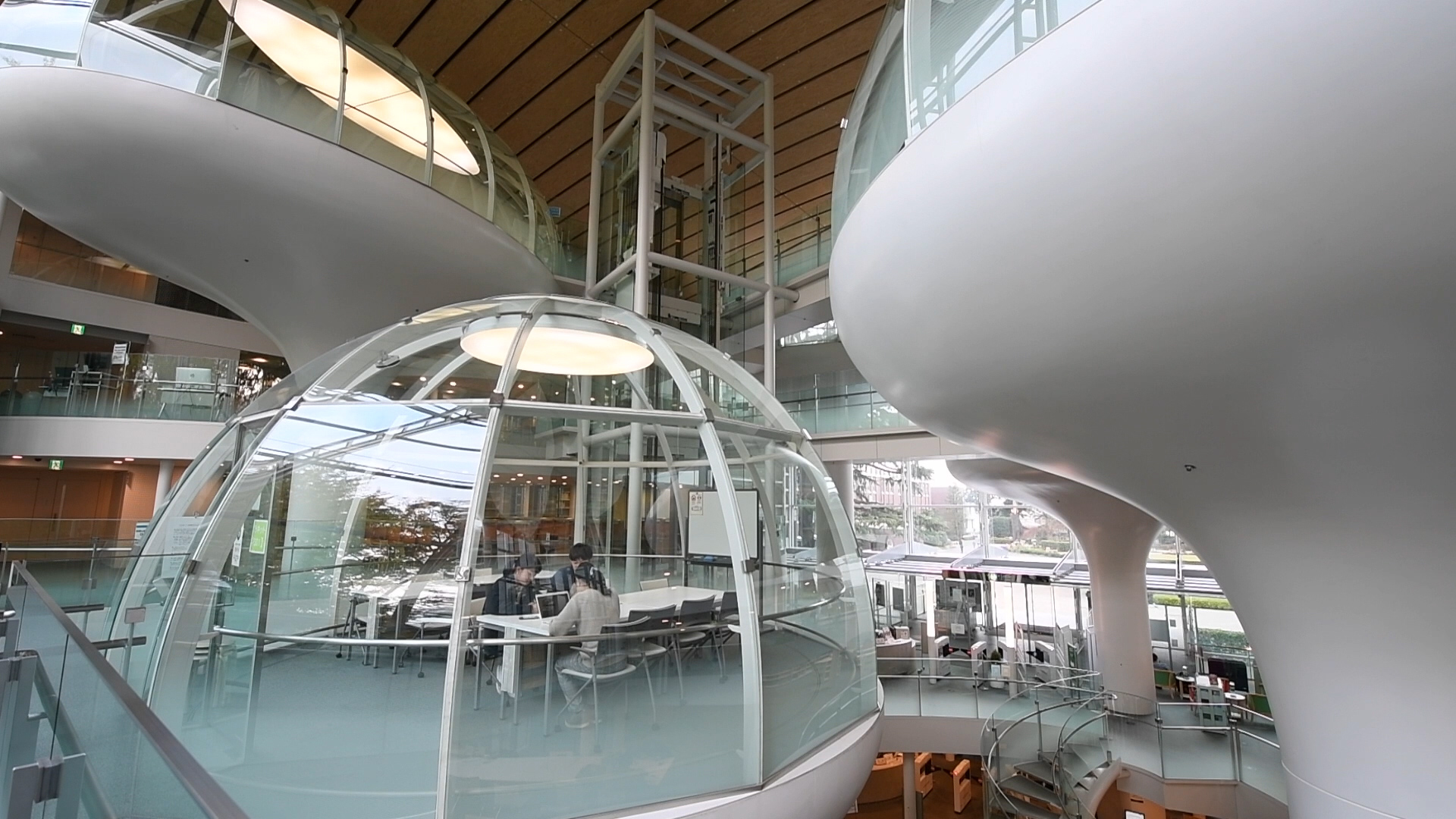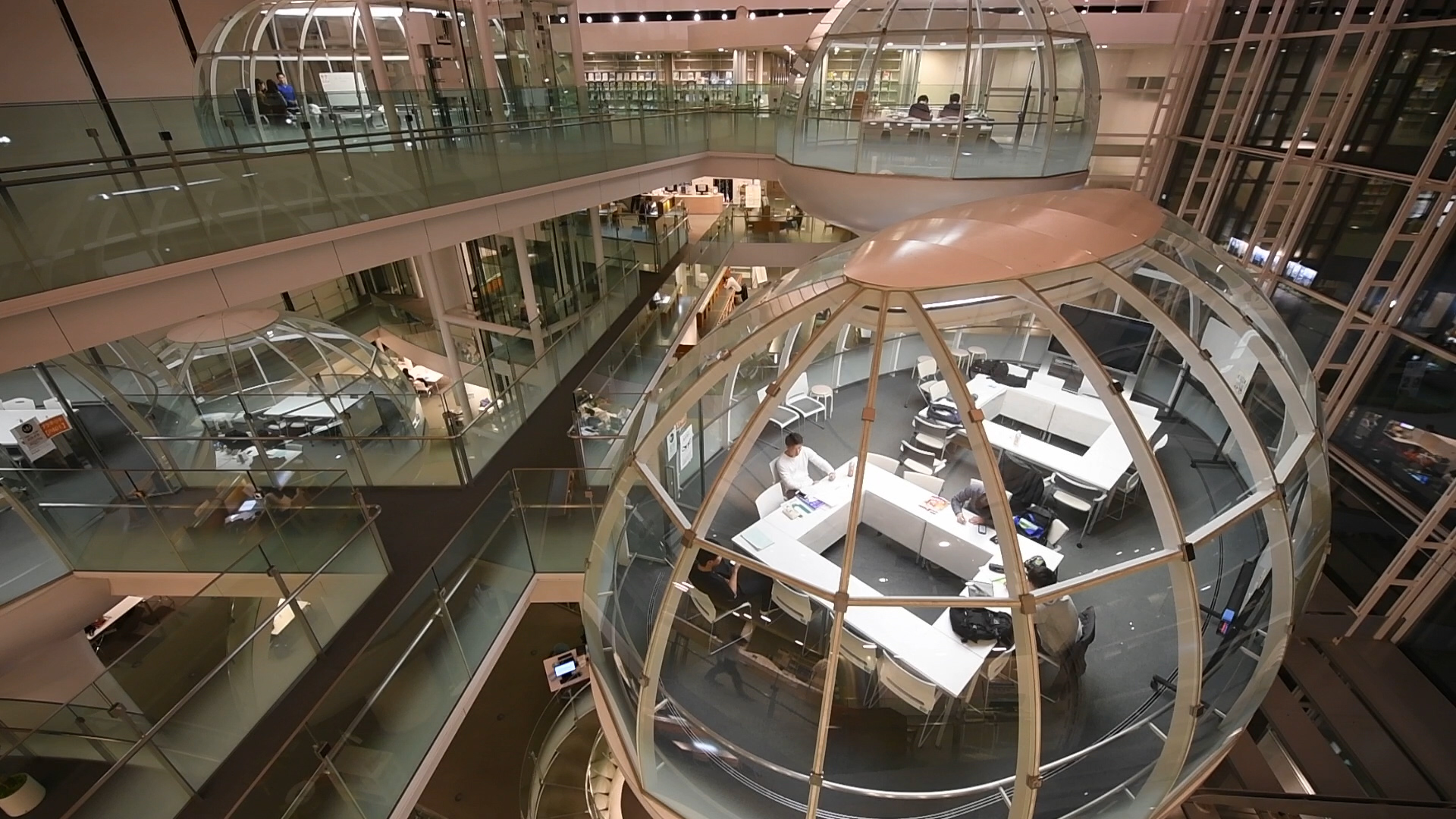 These are bubble-shaped study spaces where students can freely discuss, or carry out seminars, while enjoying a jaw-dropping view of the whole library. Studying is rarely such a pleasing aesthetic experience.
