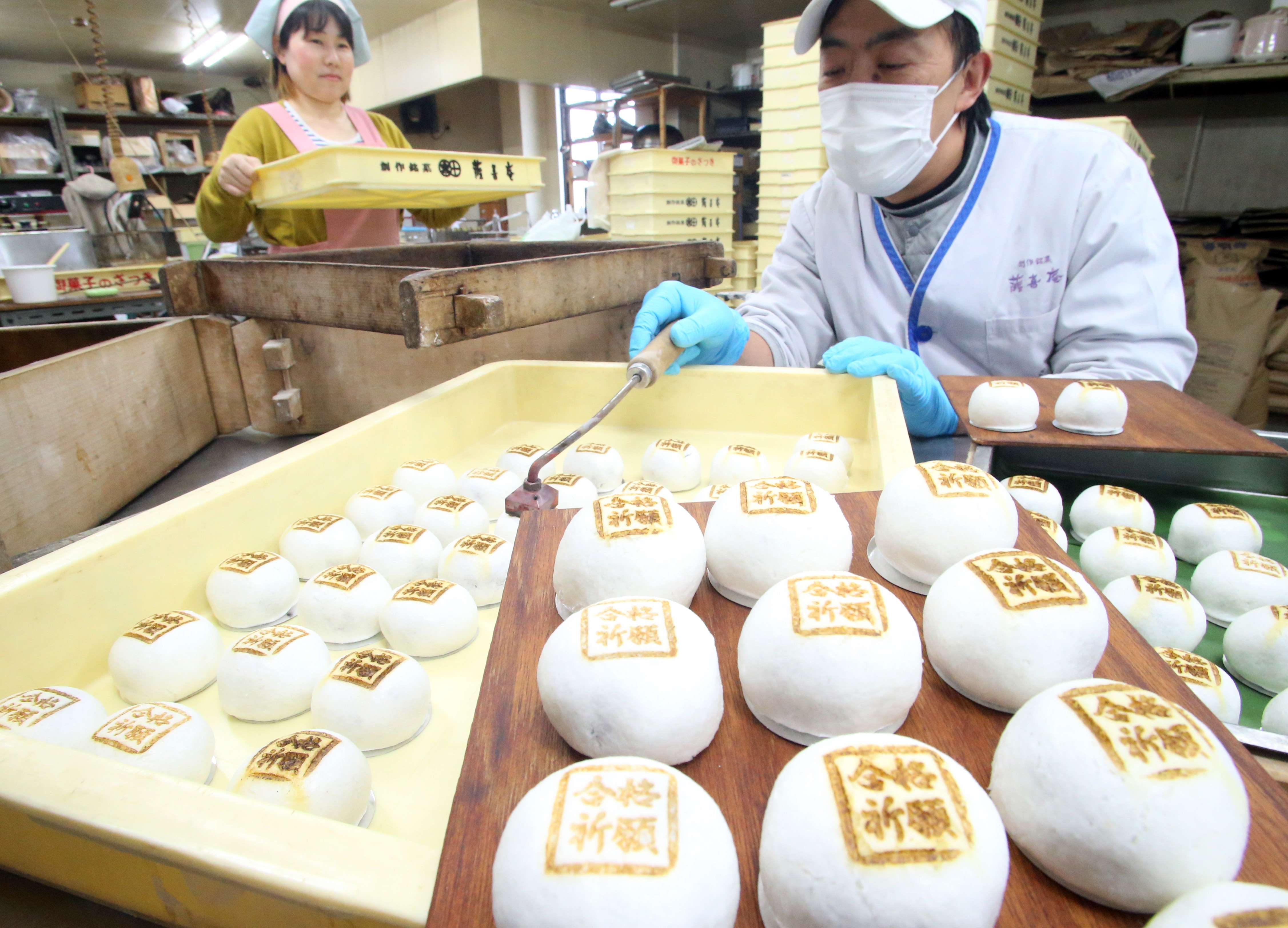 In the wagashi store called Satsukian in Takatsuki City, Osaka Prefecture, it’s the peak season for good fortune manju wagashi. These sweets are traditional mochi, filled with red bean paste.