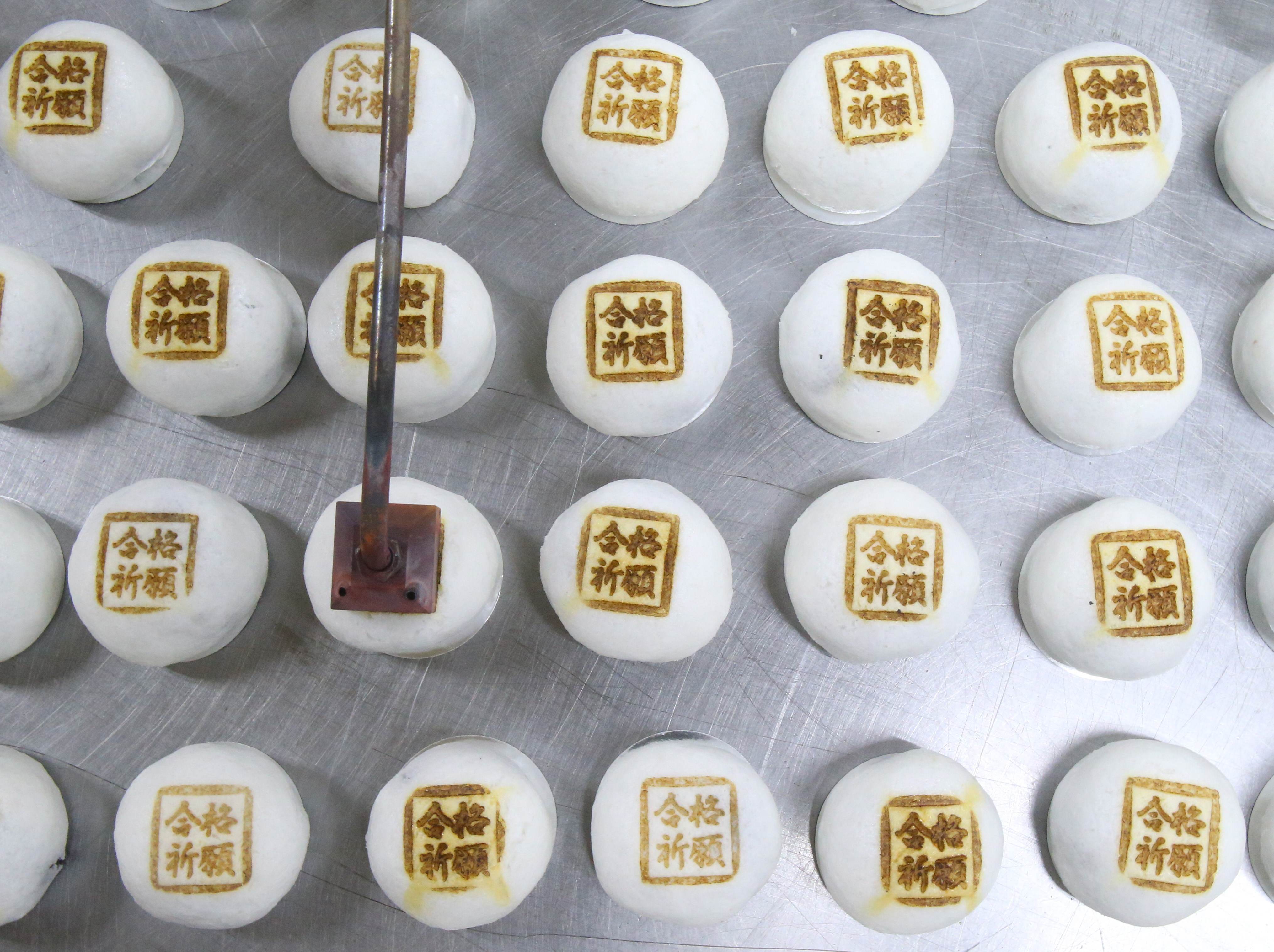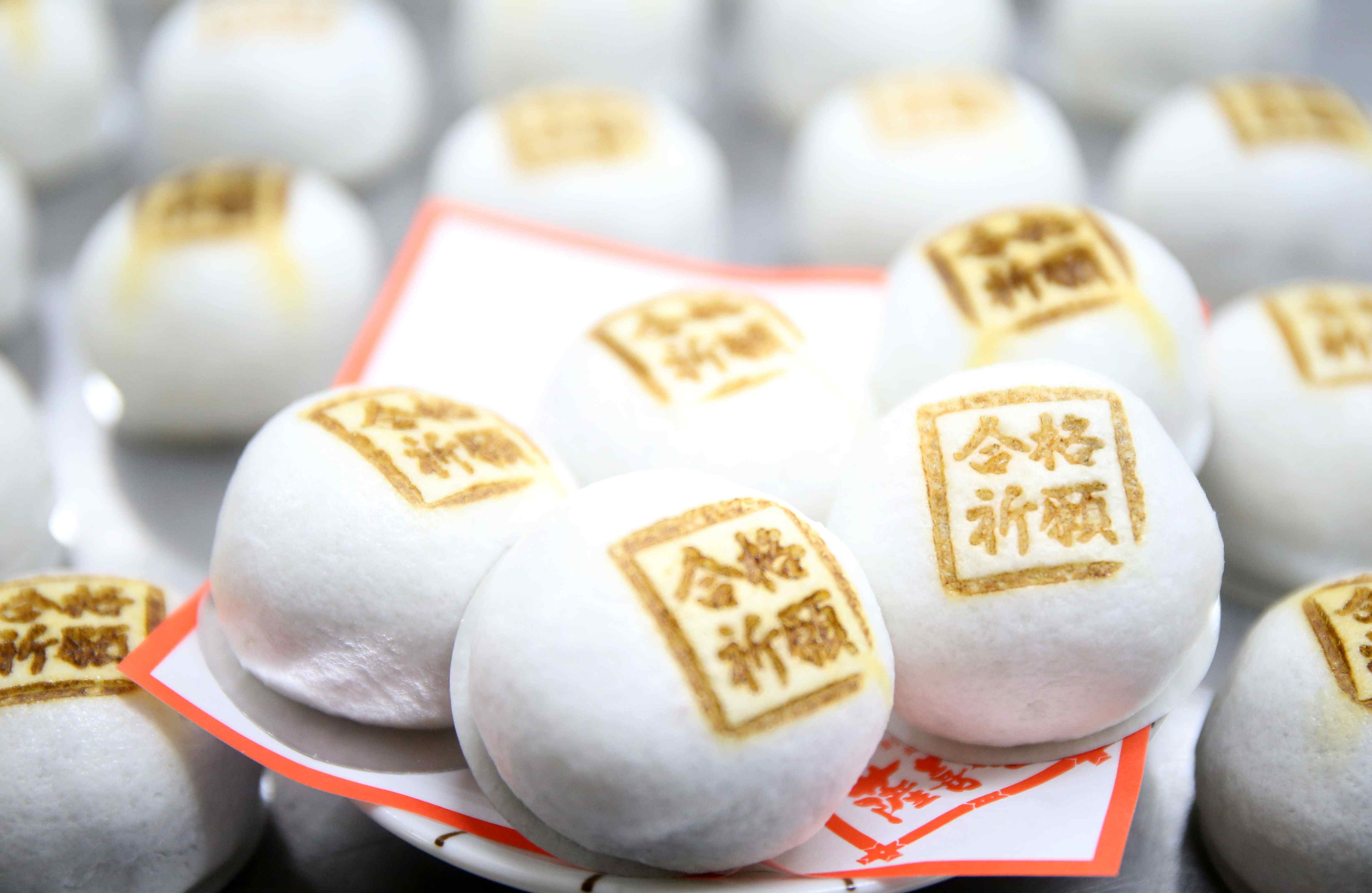 But the twist is in the detail. A stamp, which reads “合格祈願”, roughly translating as “good luck with exams,” is impressed upon each manju with a hot metal plate.