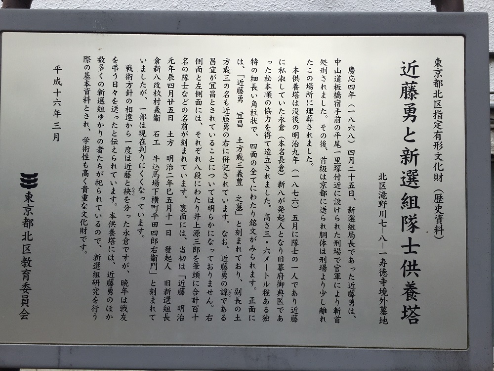 Following the alliance formed by Satsuma and Choshu forces (the Satcho Alliance), the newly-formed Imperial Forces crushed any opposition. The Shinsengumi were defeated, and Kondo Isami was captured and executed (by beheading) at Itabashi (Tokyo) as an insurgent in 1868. There are also memorial stones for Kondo Isami close to Tokyo’s Itabashi station, where he was executed.