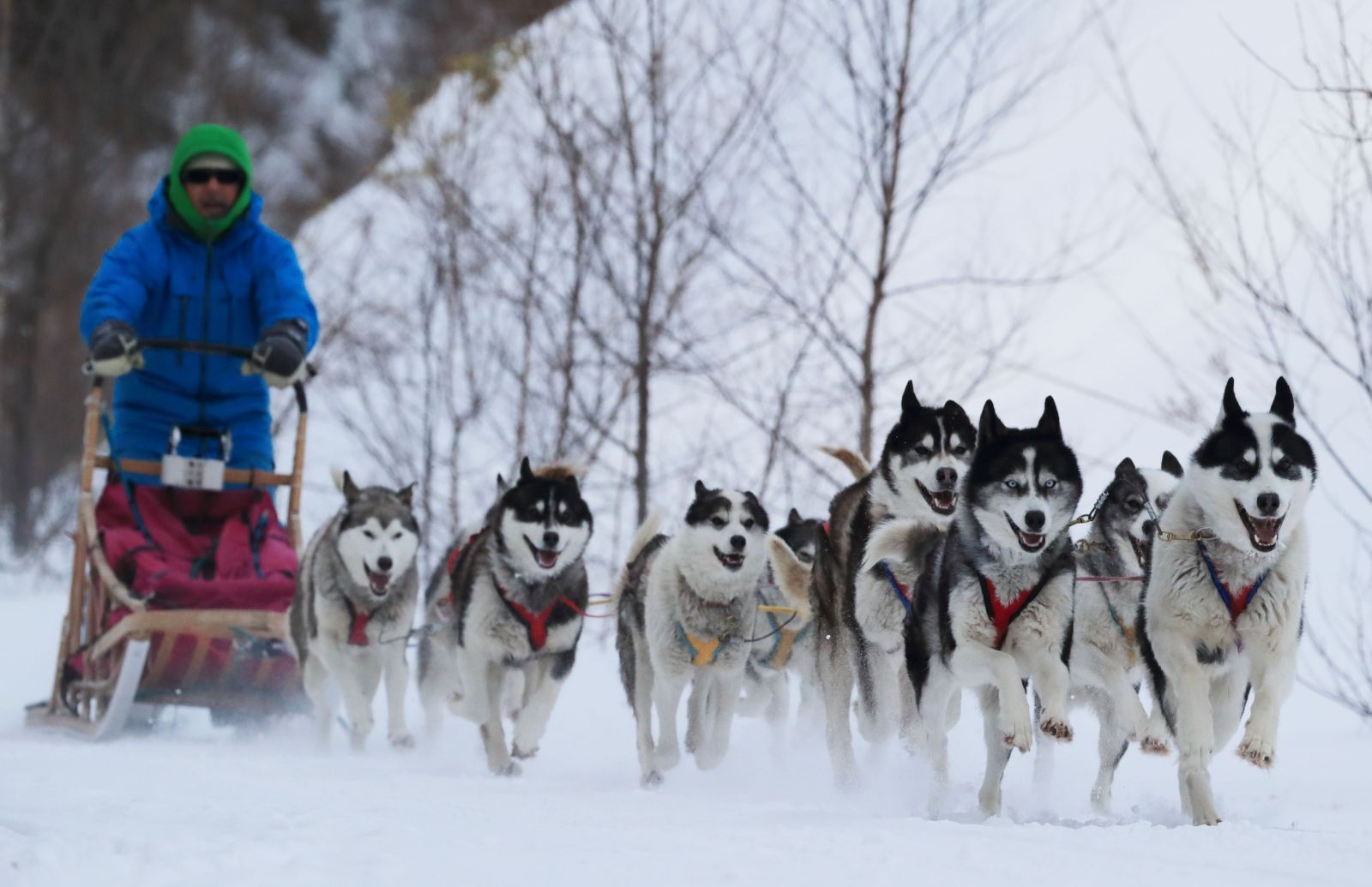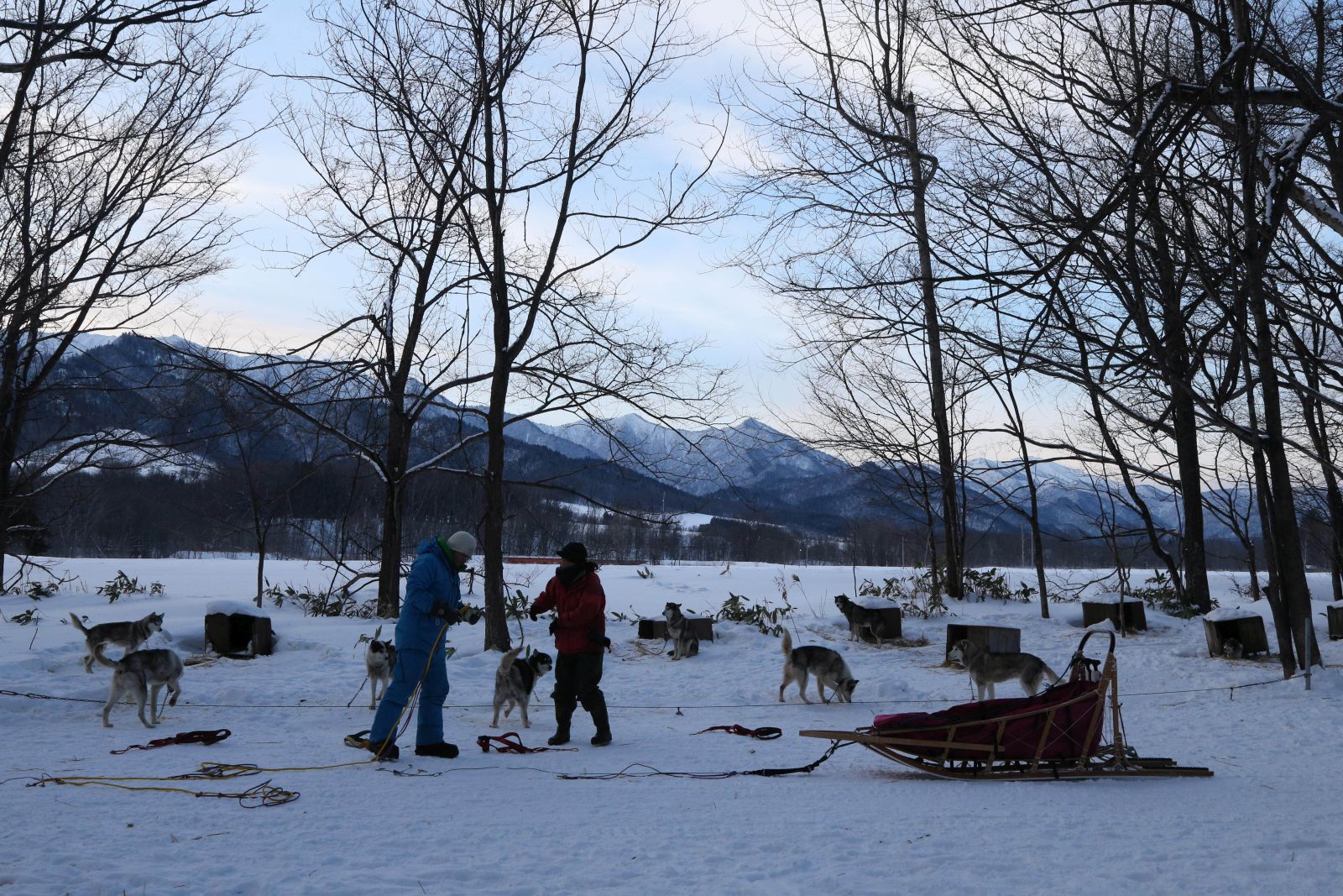 In the depths of winter, the temperature can drop below -20C in Shirataki, Engaru town in Hokkaido. Here lives a 42-strong pack of wolf dogs, most of which are Alaskan Huskies. They are managed by the company Outrider, which runs sled dog tours.