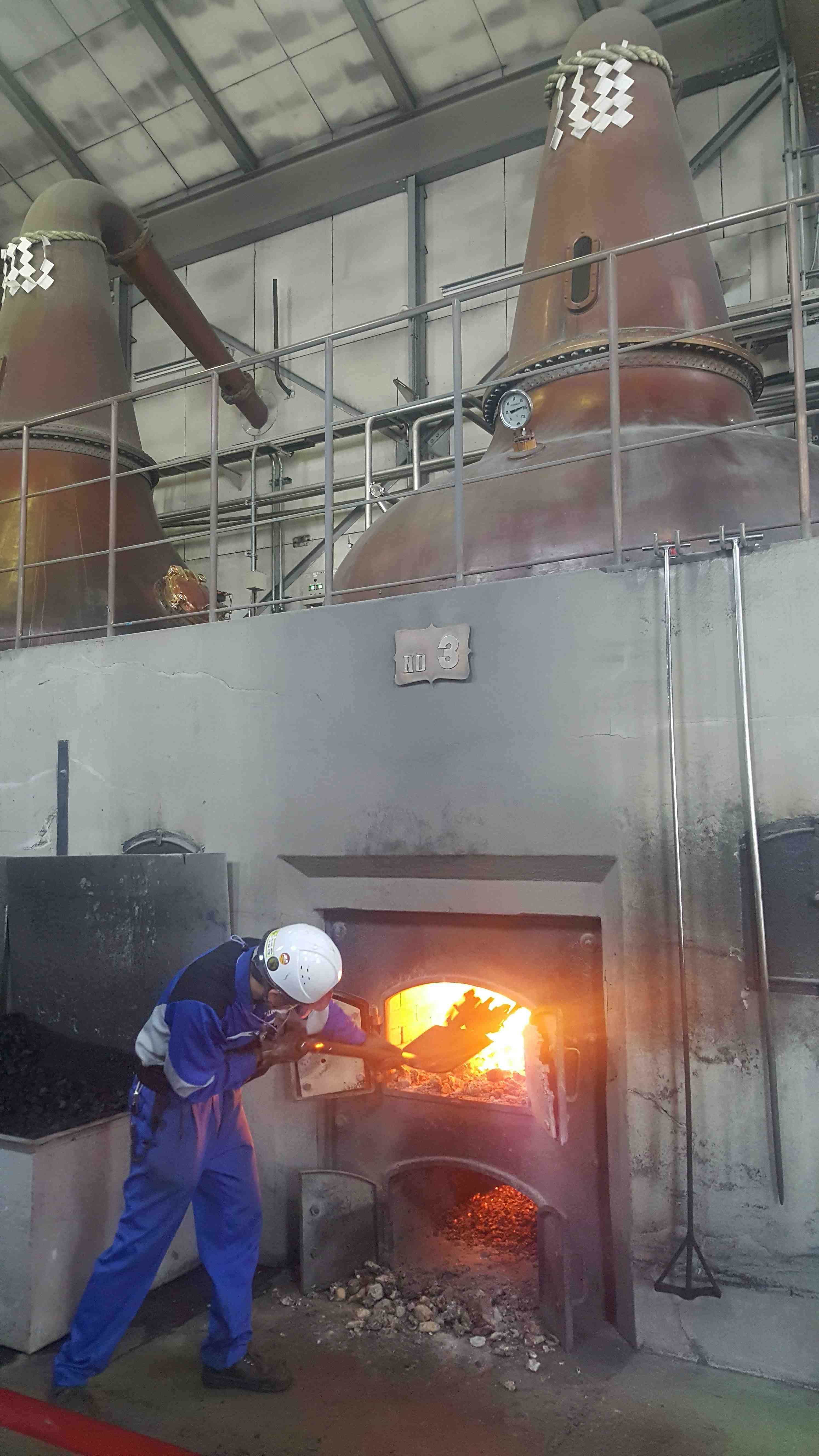 At the Nikka distillery in Yoichi, our small group of travelers is met by young women in tartan-style costumes and transparent umbrellas. Snow has started to fall again. Our first tour stop is the whisky distillery, where six gigantic copper stills are heated directly over a coal fire. A worker in a blue boilersuit shovels coals into the fire under the kettles.