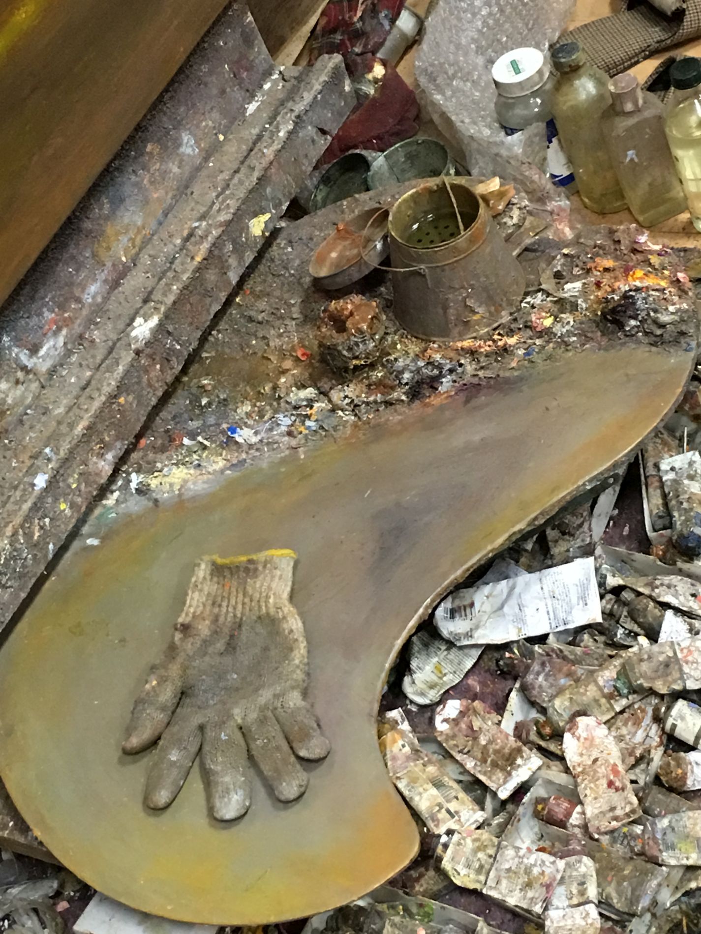 皆さんは “アトリエ”というと、北窓を持つ、天井の高い空間を思い浮かべるかもしれません。しかし、そこで仕事をする人も様々なように、アトリエも色々で、有名画家と貧乏画家でも違うし、良いアトリエなのに散らかしっぱなしのルーズな画家もいる。総じて日本画家のアトリエはきちんと整頓され、油絵画家のアトリエは床が絵具だらけで汚れているイメージが強いようです。