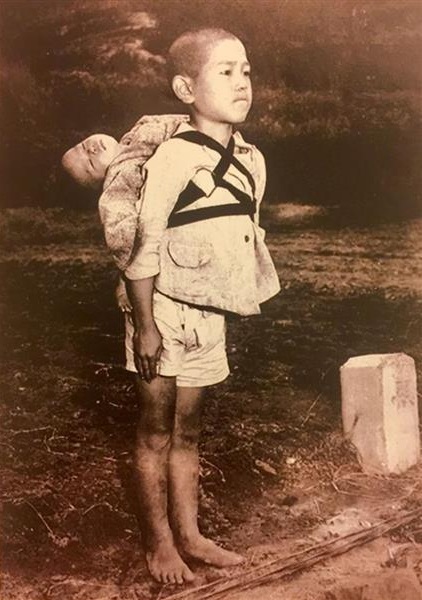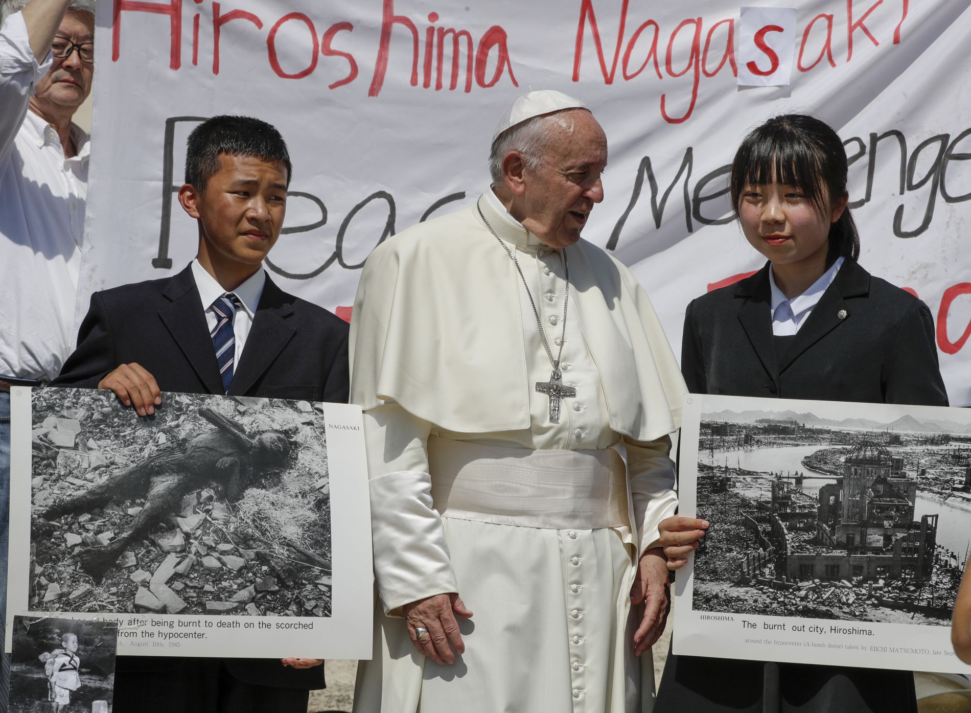 フランシスコ法王もヨハネパウロ2世同様、平和や核廃絶への強い思いを抱いている。フランシスコ法王は2017年末の休暇シーズン中、長崎原爆で亡くなった幼子の弟を背負いながら火葬場で順番を待つ1人の少年の姿をとらえた写真をカードに印刷して配布した。