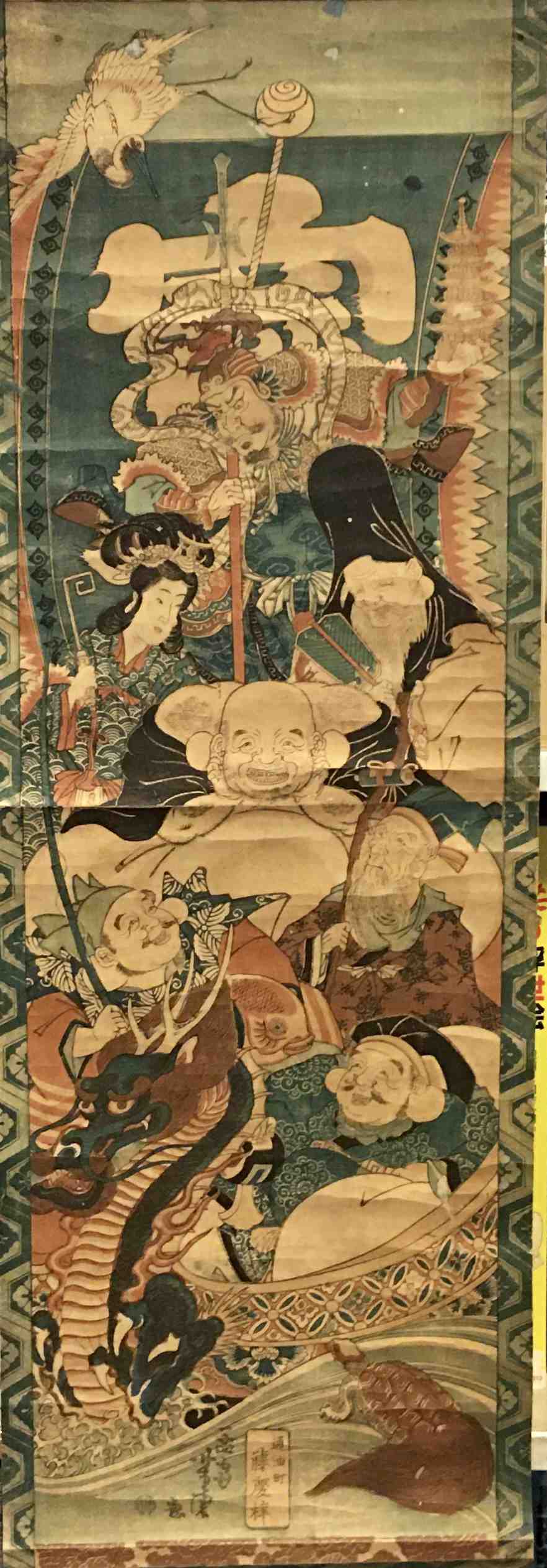 もしかすると読者の皆さんは、浮世絵と神仏の描かれた「お札」とを結びつけるのは無理があると思われるかもしれません。しかし、浮世絵というものが、庶民の暮らしをテーマにしている以上、神仏を描いた宗教版画も大変重要です。「お札」から発展し、「浮世絵」になっても、〝神仏〟というテーマは受け継がれ、民間信仰の神様である〝七福神〟や、子供達の勉学の神様として〝天神様(菅原道眞)〟等が、浮世絵の仲間に入ったという訳なのです。