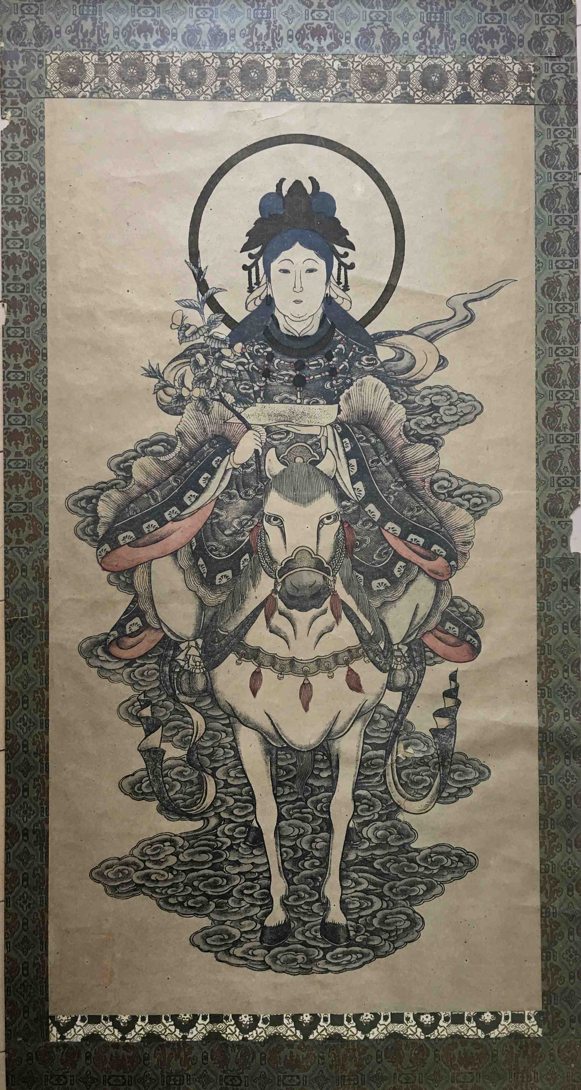 次に、初期の宗教版画で、掛け軸仕立ての「掛絵(かけえ)」というものをご覧いただきたいと思います。これらは表具も、絵と同じ木版刷りで、大変素朴な味わいのあるものです。私はこのような初期の宗教版画は、「お札」から進化していったものではないかと考えています。
