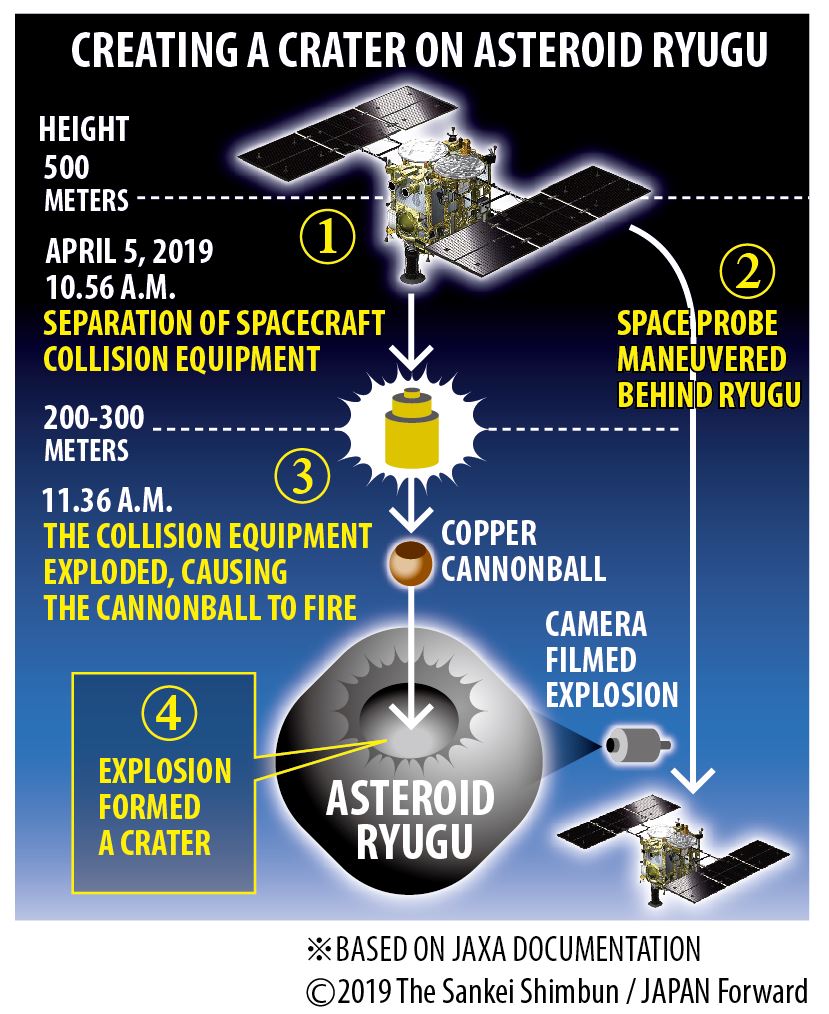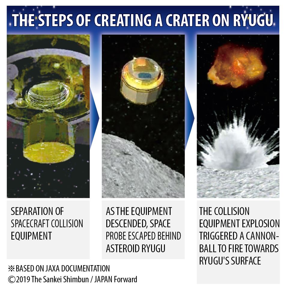 はやぶさ2は5日午前、高度約500メートルまでリュウグウに接近し、衝突装置を分離、40分後に装置を爆発させた。その衝撃で銅の円板が弾丸状に変形してリュウグウに向けて発射され、秒速2キロで地表に衝突した。現場付近は岩石などが飛散し危険が大きいため、この間にはやぶさ2の機体はリュウグウの裏側に退避させた。