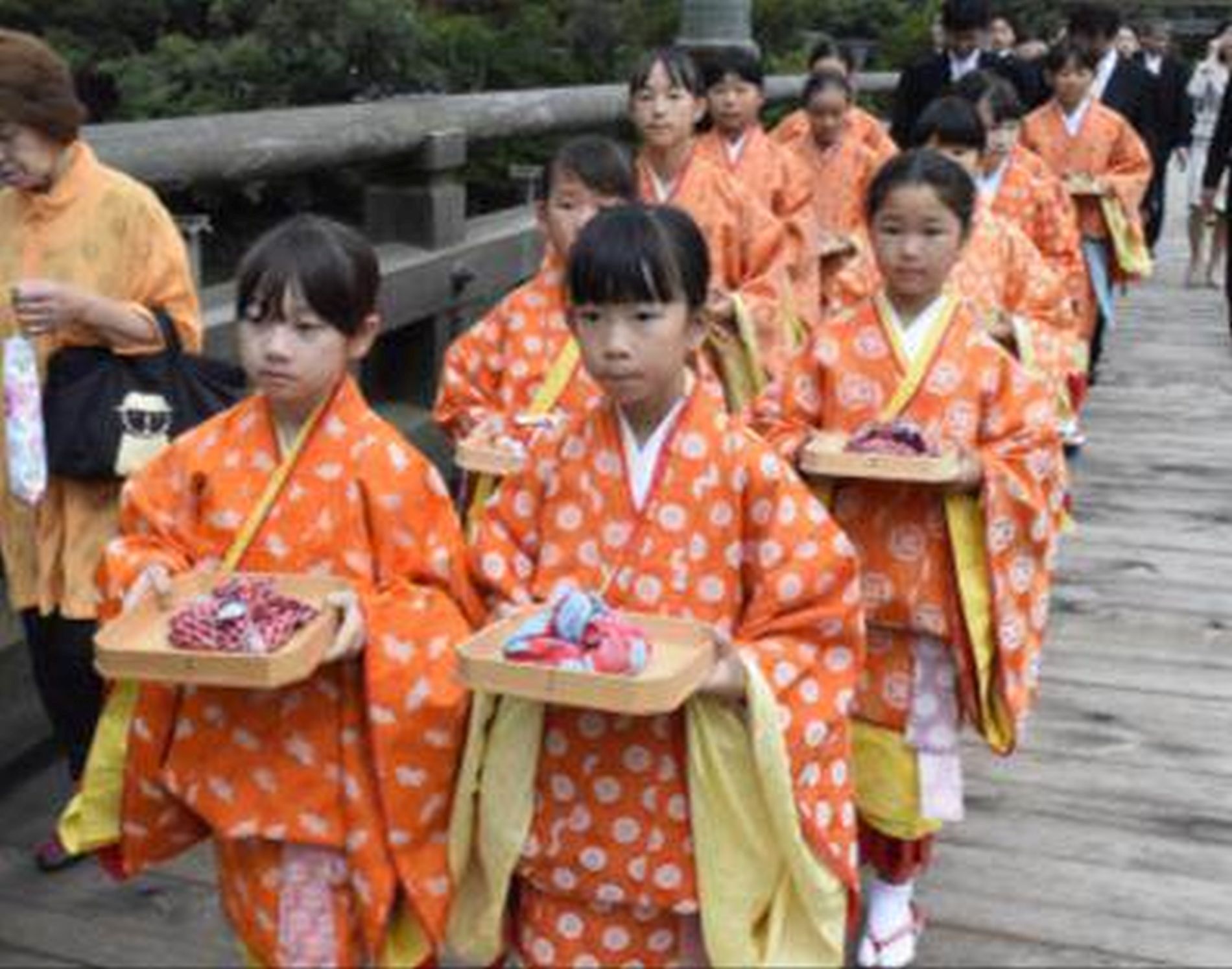 式年遷宮はもうーつ、私たちの技と心を次世代へ伝承させてゆくことを可能にするという、 非常に重要な役割を果たしています。 この継承は建築技術の伝承のみならず、714種の御装束・神宝の調製に関わる1000年以上にも及ぶ美術の伝統をも維持しているのです。遷宮後は、古い御殿は解体され、その大部分の木材は日本全国のその他の神社へと譲与されるなどして再利用されます。 また正宮の屋根を支えていた棟持柱は慣例として、内宮入口にかかる宇治橋の鳥居として再利用されています。