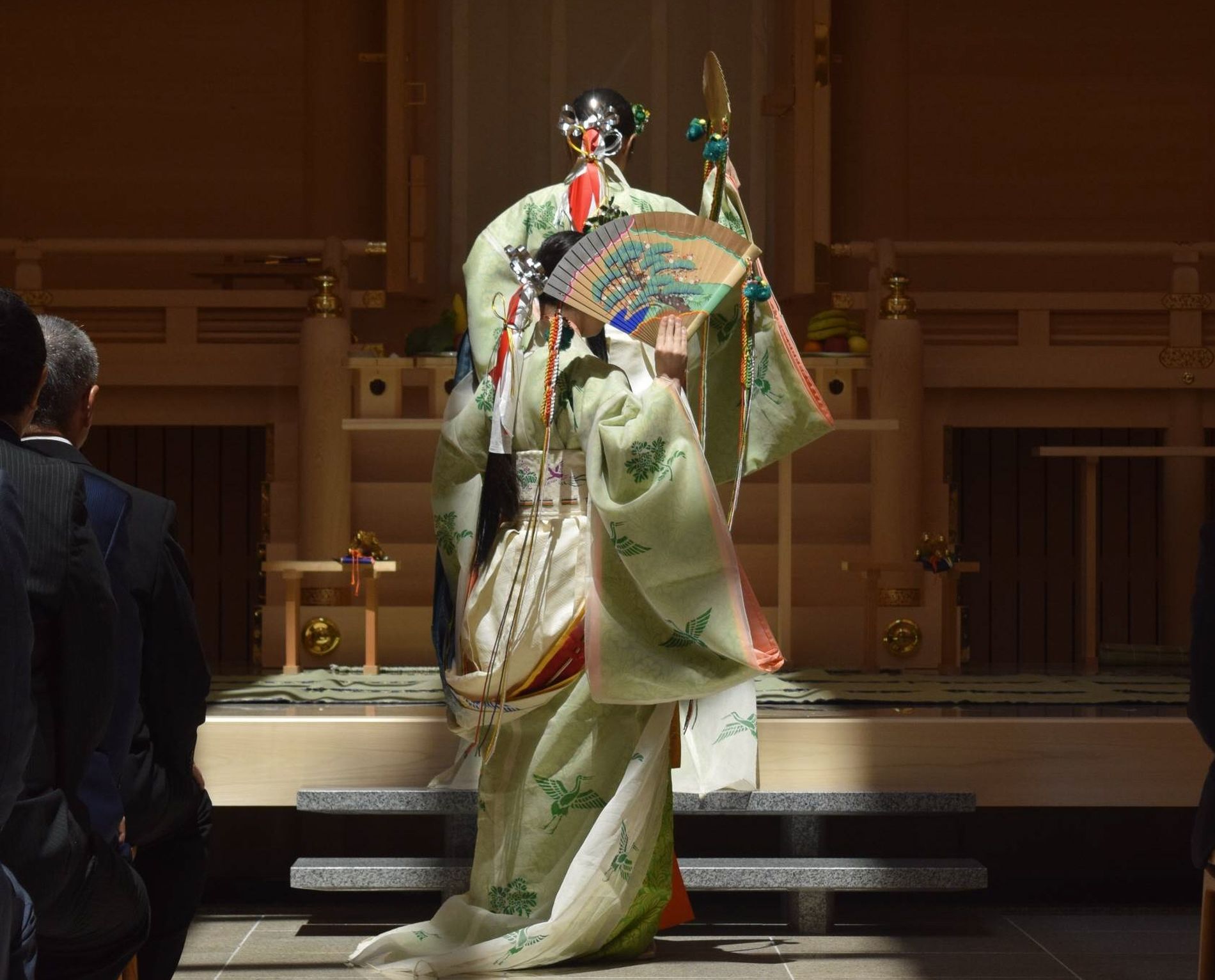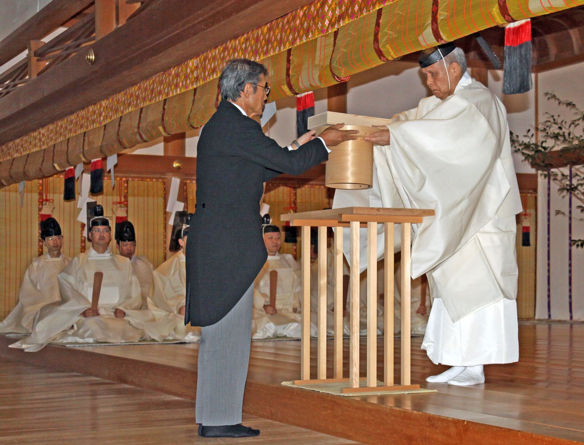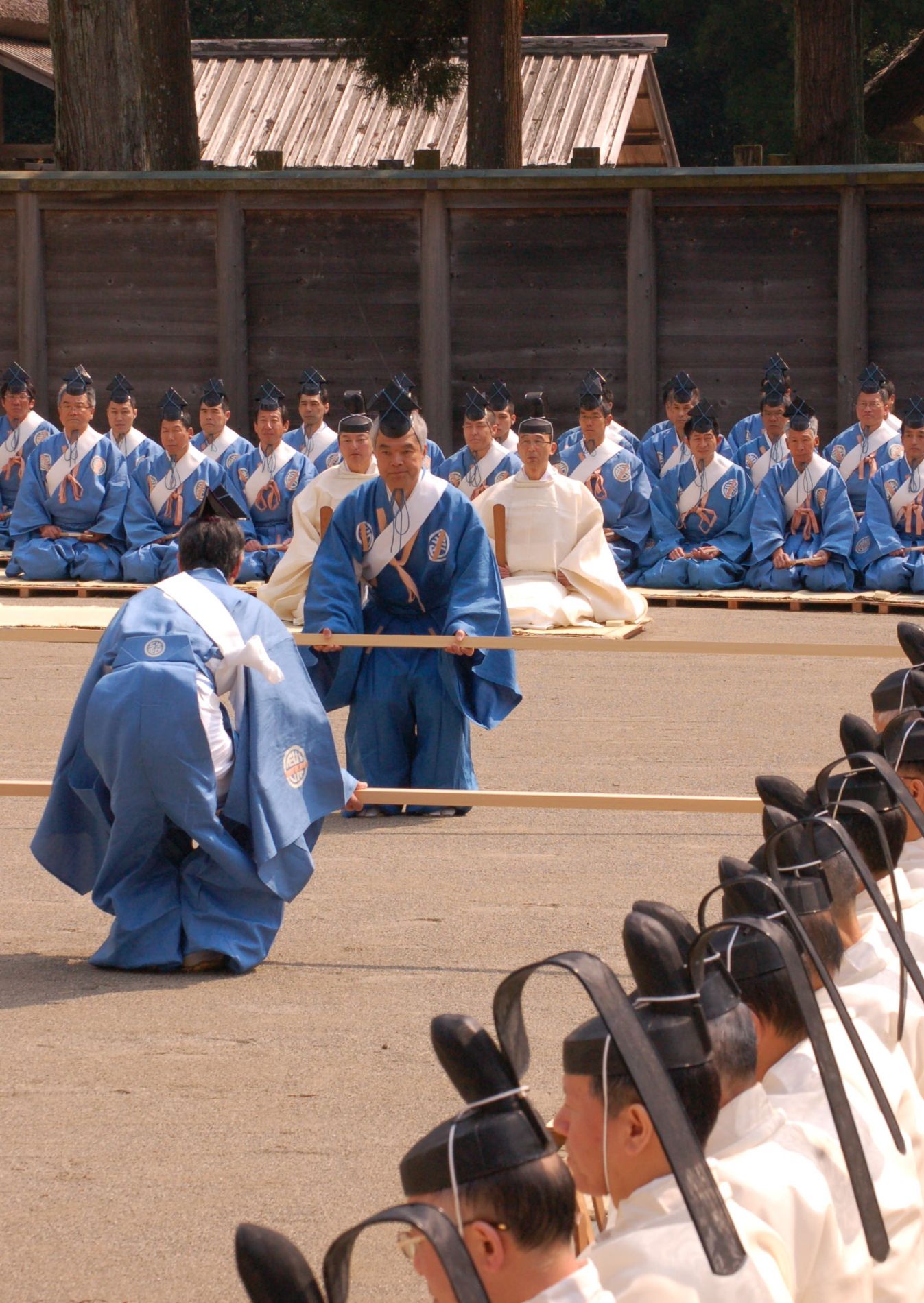 いくつかの重要な祭りには、天皇が神宮に勅使を差し遣わし、幣帛(へいはく)と呼ばれる織物を奉納します。またいくつかの祭儀においては、神楽と呼ばれる神聖な歌舞音曲が奏されます。